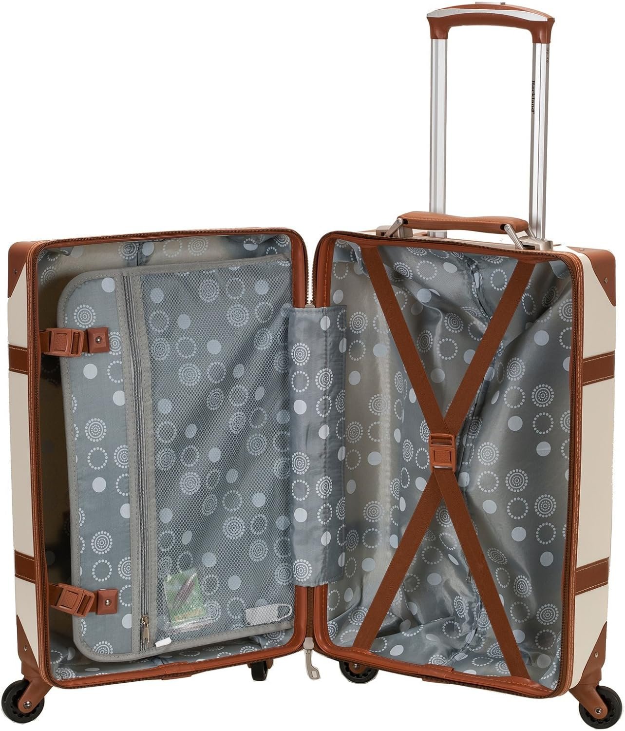 Vintage look rolling trunk will bring a sense of sophistication to your travels. This trunk has a sense of nostalgia but has been updated with features for the seasoned traveler. Four full rotation wheels make effortless navigation through crowds and to your destination. Made of ABS which provides impact resistance and toughness for long time use and handling. Corners are wrapped in PVC for additional protection. Telescoping handle and top carry handle, interior mesh zip pocket & elasticated pocket storage. Measure 13″L x 9″W x 23″H (with wheels) and weighs only 6. 5 lbs!