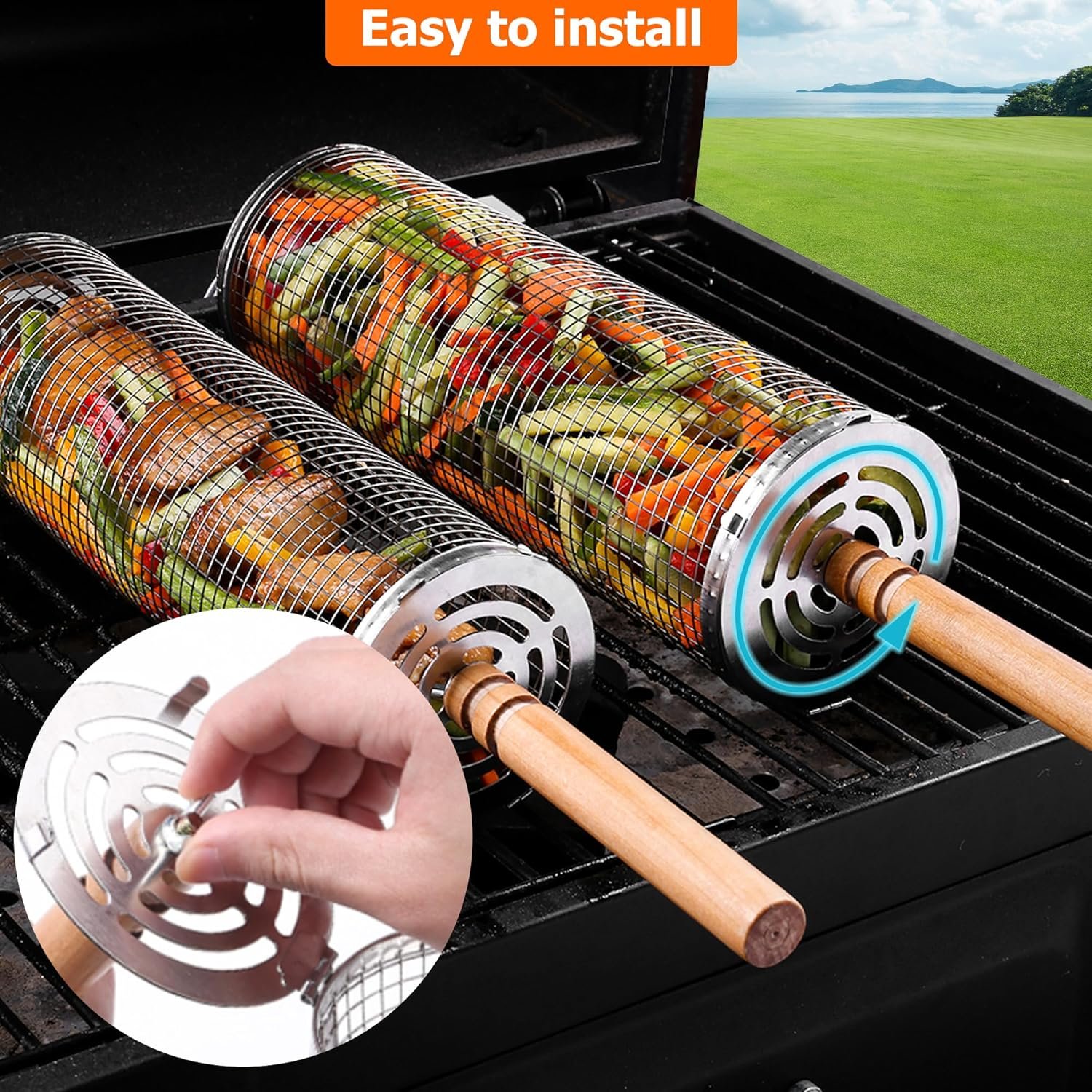 【Rolling Grilling Basket】:When you first use the Rolling Grilling Basket for your vegetables and meats, you will be amazed at the ease with which it allows your ingredients to cook evenly, rotates 360 degrees to ensure that food is evenly heated, making it easy to grill foods that you were afraid to try before.