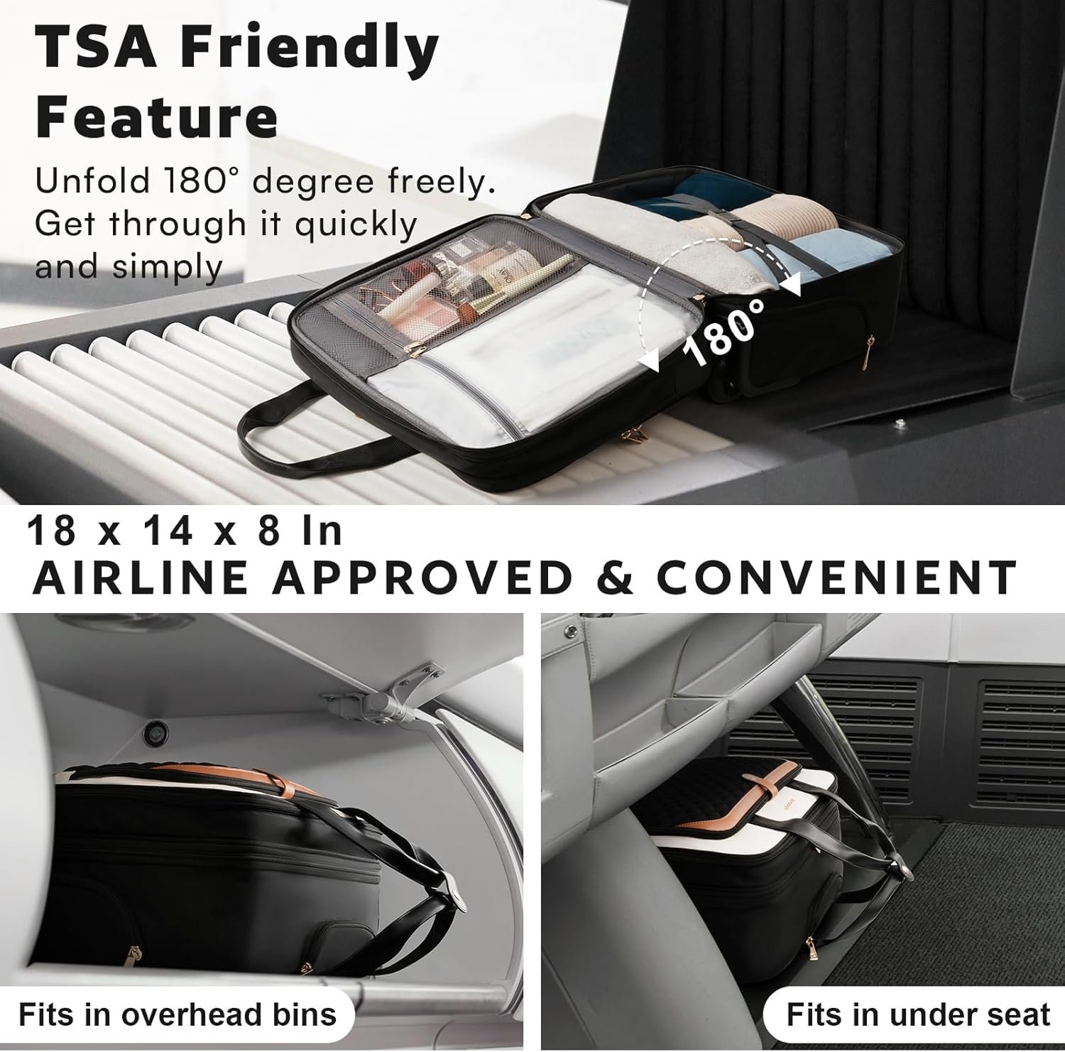 TSA-Friendly & Spacious Compartments: Rolling Computer Bag for women enjoy hassle-free airport with the TSA-friendly design, The size of the overnight bag with wheels is 17.5*13.7*7.0 inches (L*W*H). opening 180 degrees for quick security checks. The main compartment of this rolling briefcase for women for work features elastic bands with buckles for 2-3 days clothes. There’s also a separate padded laptop pocket, and organizational areas for pens, documents, Can also store paperwork, binder.