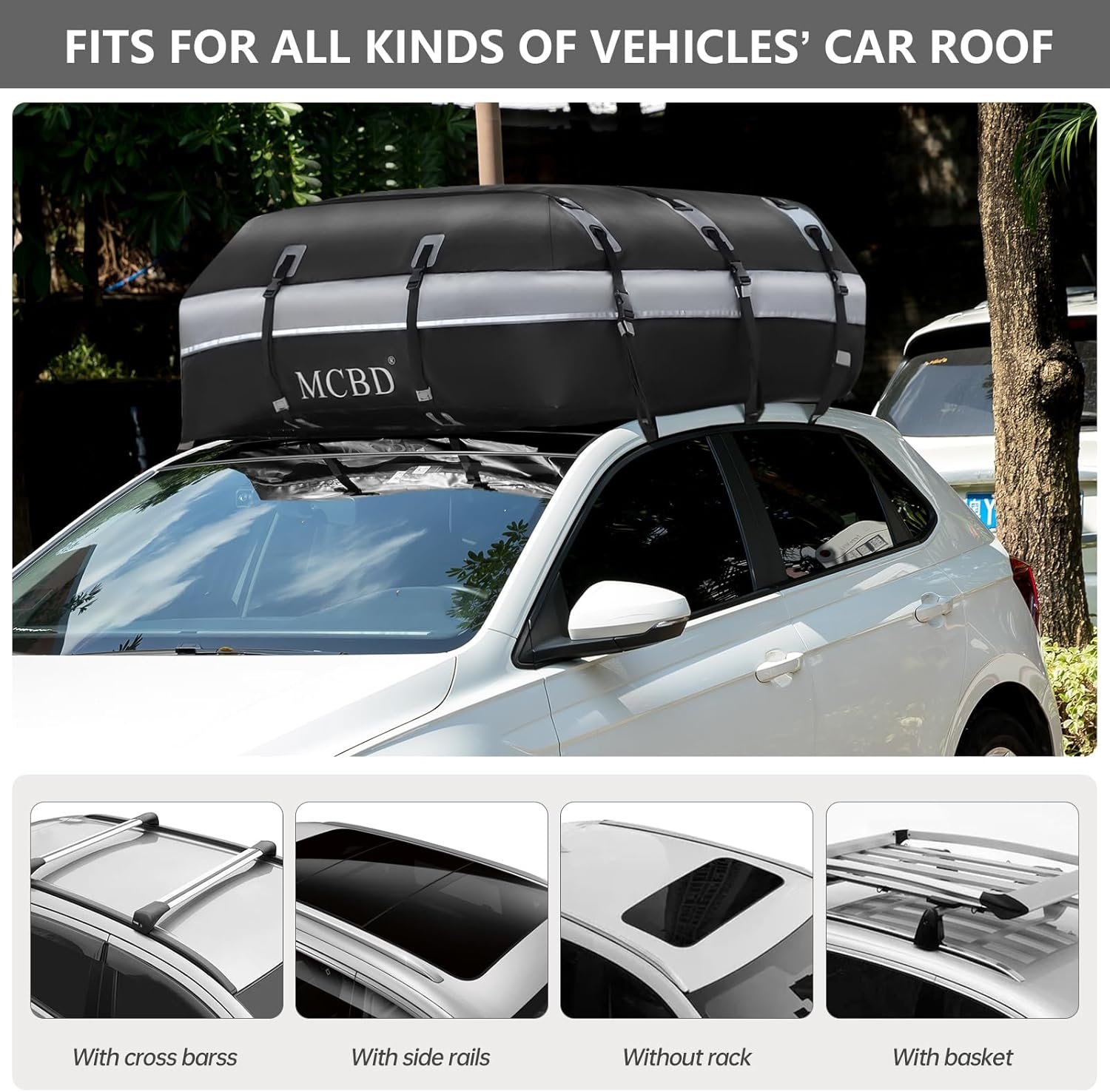 UPGRADED WATERPROOF ZIP: We notice that the straps of other cargo bags can easily rip from the seam, so the MCBD roof bag doubly reinforced the strap seam. And all seams of this cargo bag are heat welded and stitched to ensure they are watertight. 100% Waterproof, waterproof zipper with 6 inches extra wide velcro zipper flaps. It provides weather protection even in extreme conditions such as wind, sun, rain, snow, and sand.