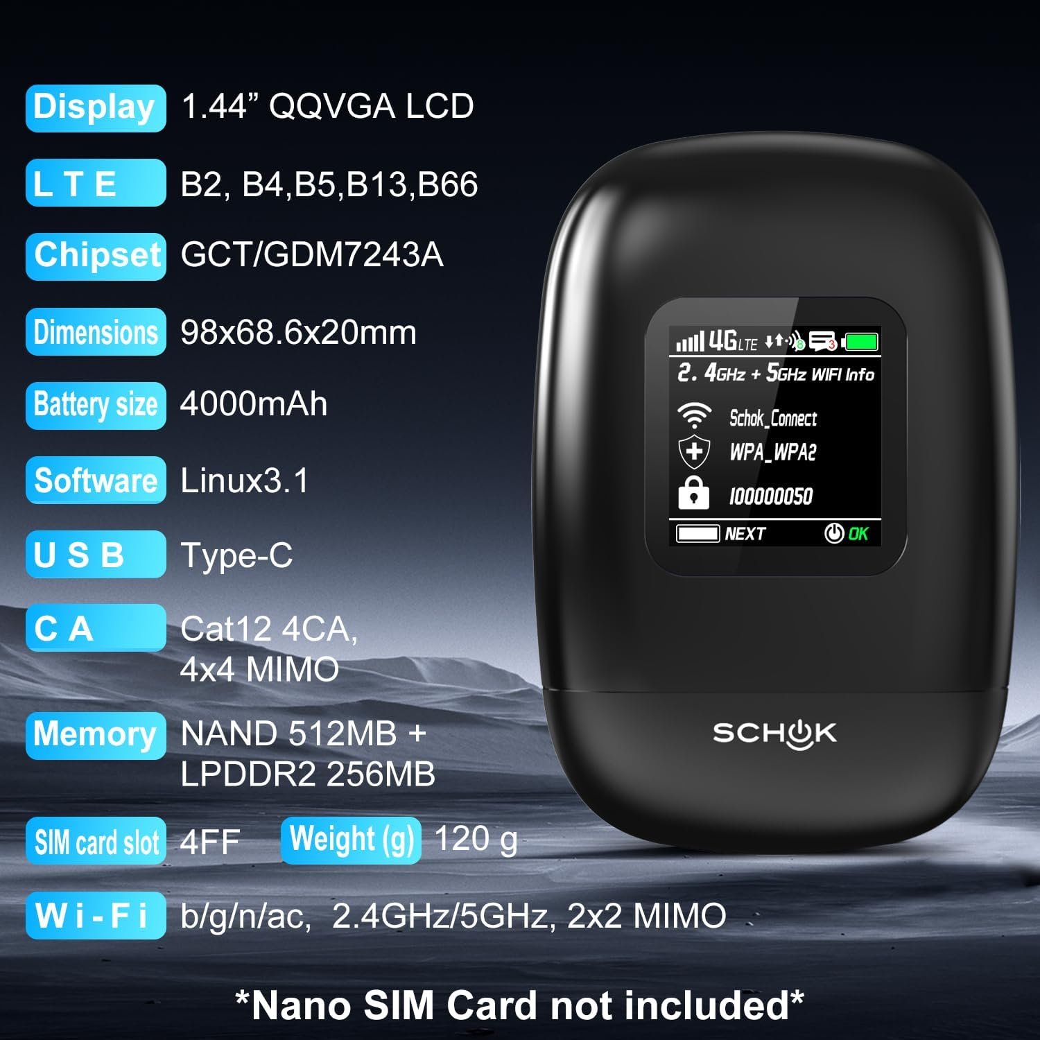 SCHOK 4G LTE Mobile Hotspot – Cat 12 Portable WiFi for Travel, Dual Bands (2.4GHz/5GHz), 600Mbps Download High Speed, Supports 16 Connected Devices, Unlocked for Verizon & MVNOs ONLY