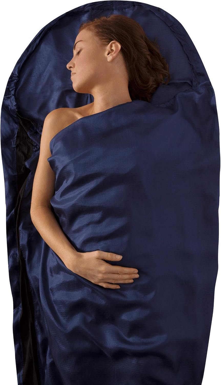 Mummy with hood shape is tapered for sleeping bags; liner measures 82 x 37 inches, packs down to 4.5 x 4 x 2.5 inches in included storage case, and weighs 4.8 ounces