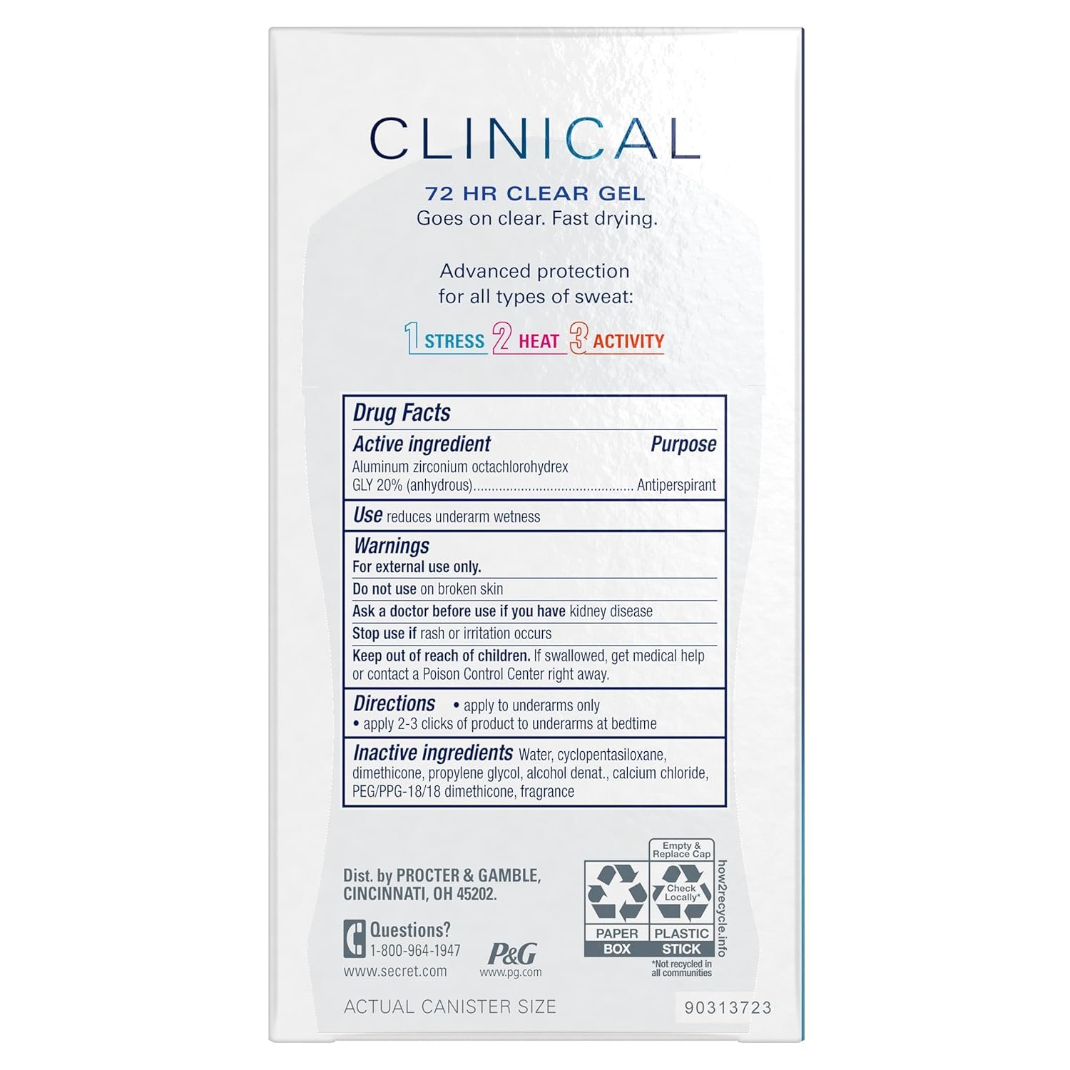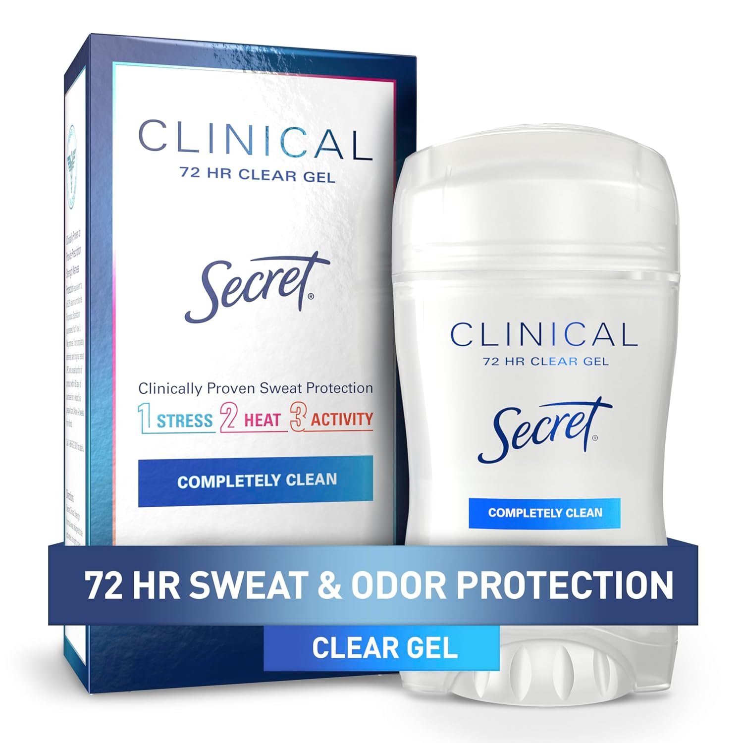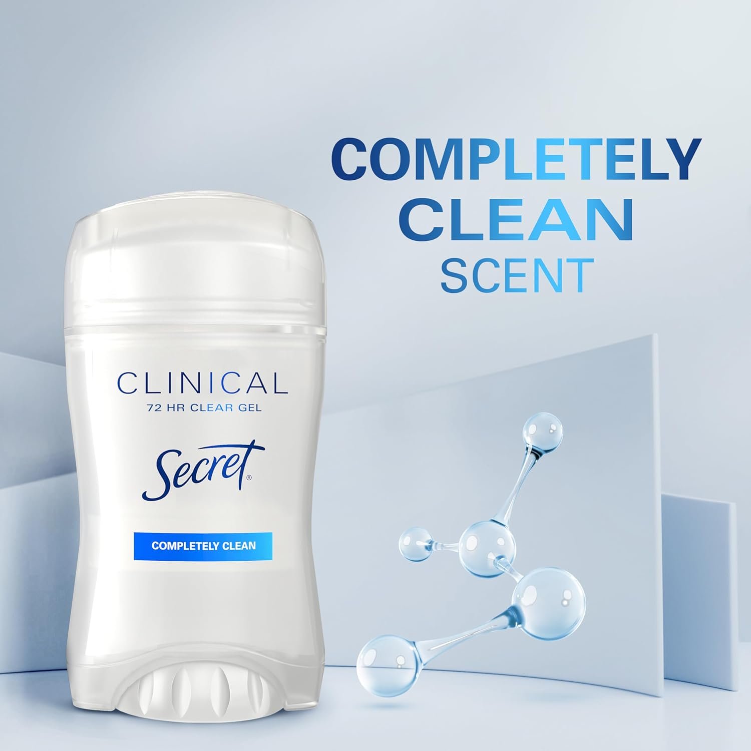 Secret Clinical Strength Antiperspirant Deodorant for Women, 3X Stress Protection, 72hr Sweat & Odor Protection, PH Balancing Minerals, Clear Gel, Completely Clean Scent, 1.6 oz