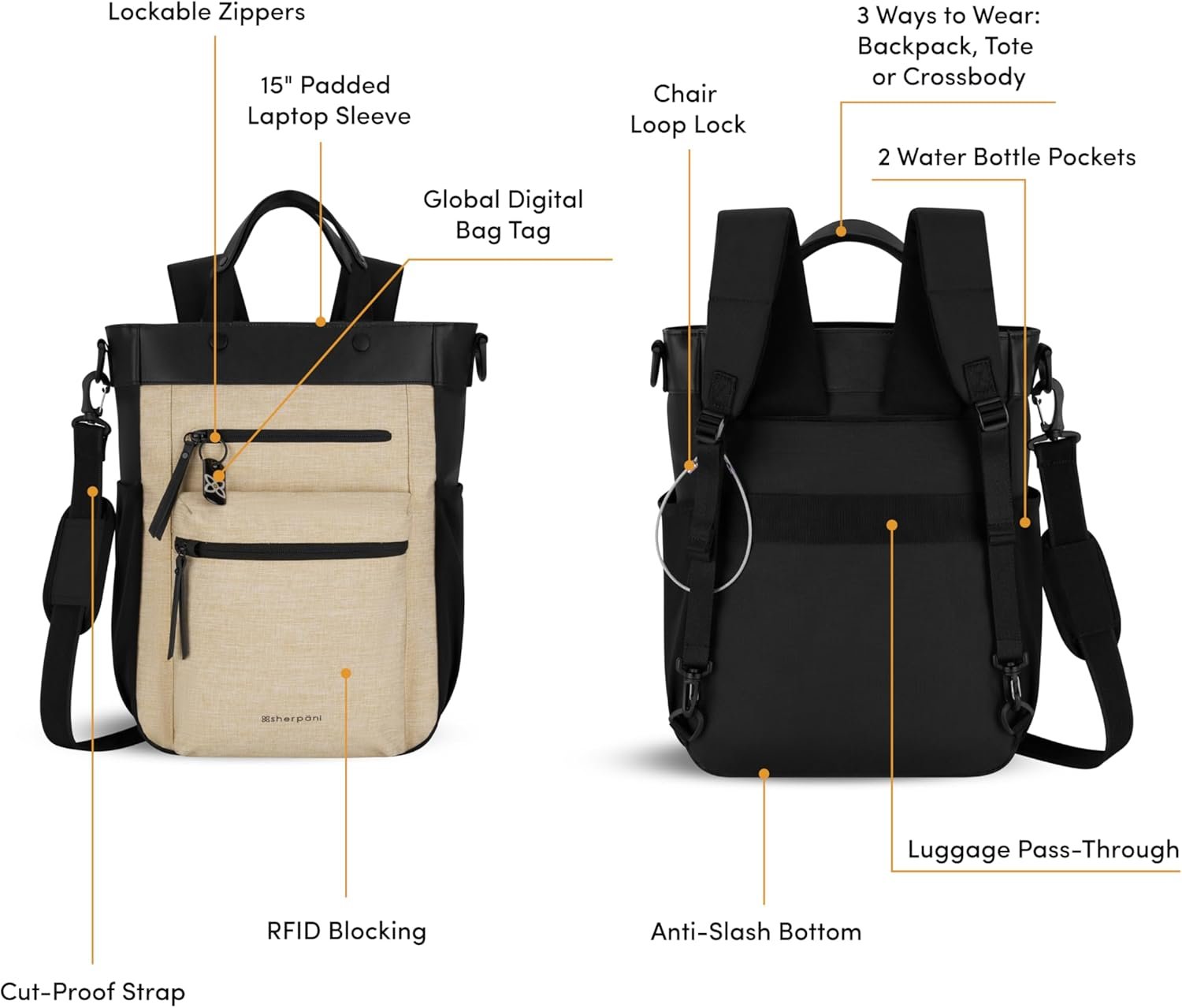 Sherpani Soleil Anti-Theft Convertible Backpack, 3-in-1 Tote, Crossbody Bag, Purse for Women, 18L Lightweight Travel Gift with RFID Protection, Fits 15” Laptop (Straw)