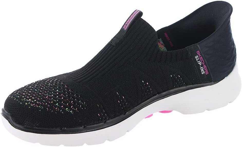 Step up your routine with easygoing comfort wearing Skechers Hands Free Slip-ins™: GO WALK 6™ – Valentina. Designed with our exclusive Heel Pillow™. This style features a Stretch Fit® engineered knit upper with a Skechers Air-Cooled Goga Mat™ insole, lightweight ULTRA GO® cushioning midsole and high-rebound Hyper Pillar Technology™ for added support.