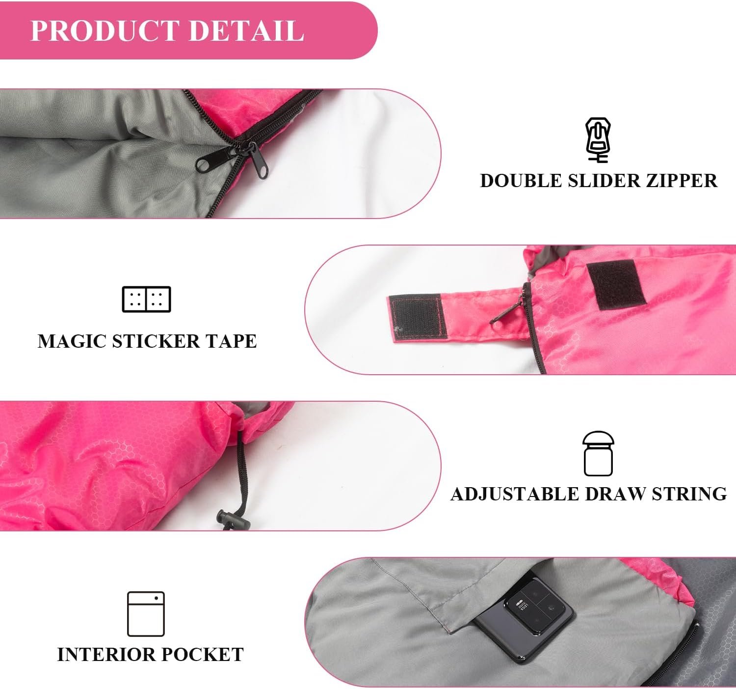 Excellent Design: High quality double-sided zippers are snag-free. Tug the headrest drawstrings to bring the sleeping bag a little closer to your head for extra warmth in cold weather. Side zippers allow a pink and a blue one to be spliced together to become a double sleeping bag.