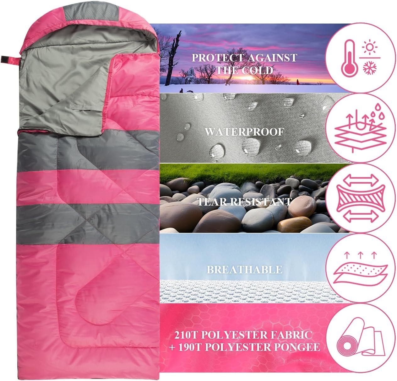 Sleeping Bags, Camping Sleeping Bag for Adults, 3 Season Warm & Cool Weather, Lightweight Waterproof Sleeping Bags for Indoor Outdoor Camping Traveling Backpacking, Pink/Blue/Black