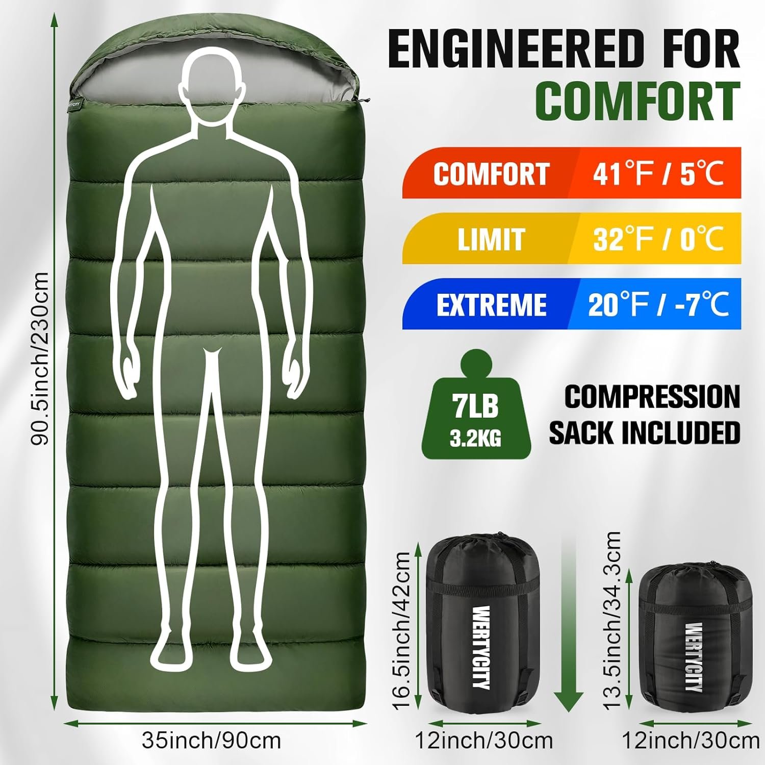 EASY TO PACK – This lightweight sleeping bag package size is 12×16.5in, weight 6lbs. WERTYCITY provides a durable compression sack for stuffing your sleeping bag into. Starting at the bottom, stuff the bag in, then tighten the heavy-duty straps for ultimate compressibility.