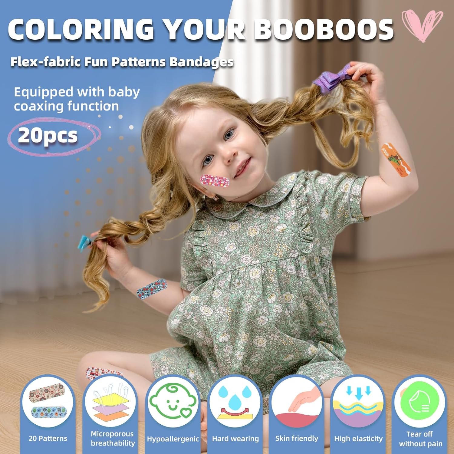 🌈【COLORING YOUR BOOBOO】- This emergency kit contains 20pcs soft flexible fabric bandaids in 20 different fun patterns. The fabric allows it to breathe and flex with movement keeping booboos clean. They stay on so much longer than others, even when they get wet. With these Flex Fabric bandages, you can have them on for a very long time and not have any sort of reaction. Plus the colors and patterns are still fun for the kids to wear.