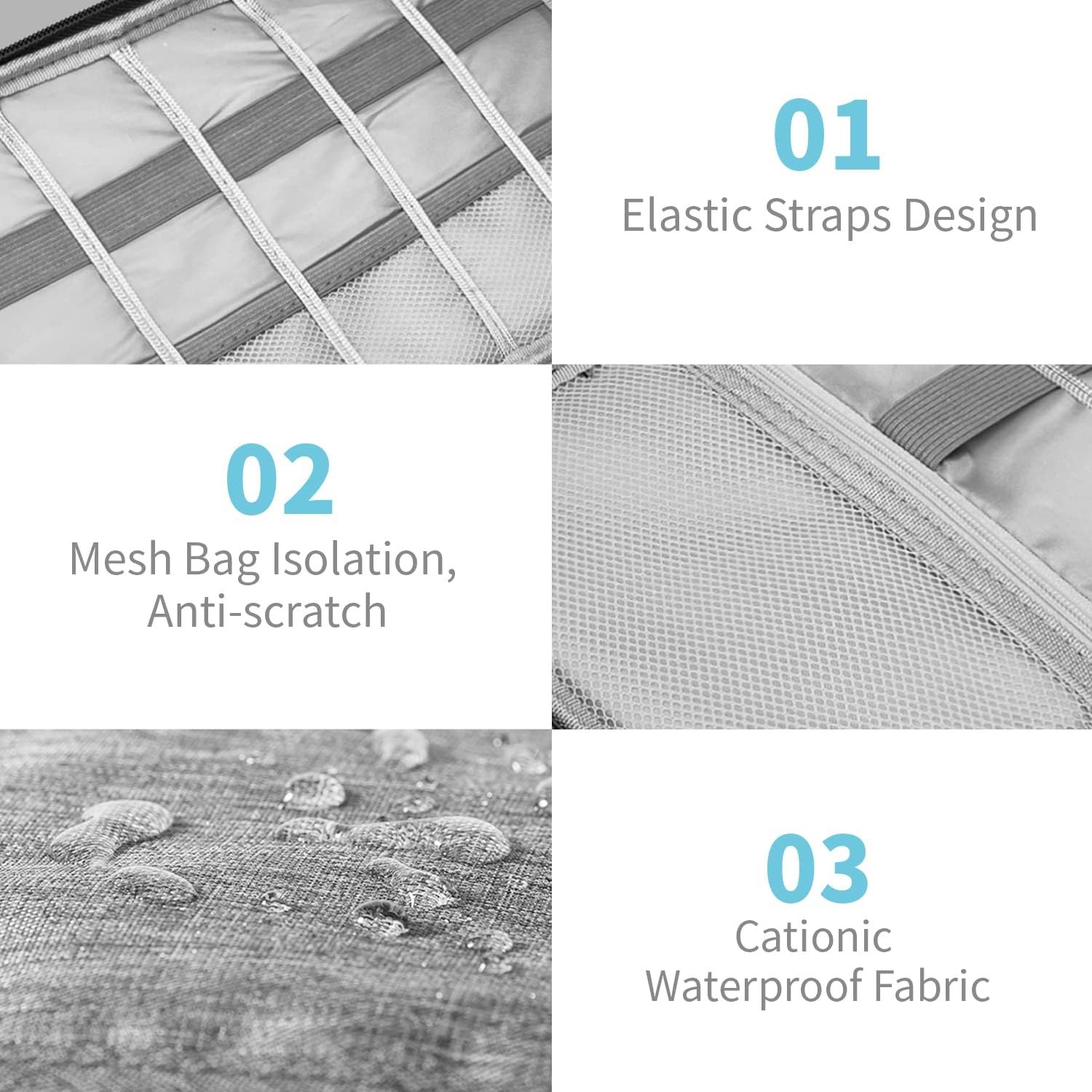 Safe Storage:It has one mesh pocket with zipper, 5 elasticized mesh segments and multiple elastic loops,so you can store multiple sizes of cables.Classify and store your items to make them excellent travel cord organizer and travel cable organizer