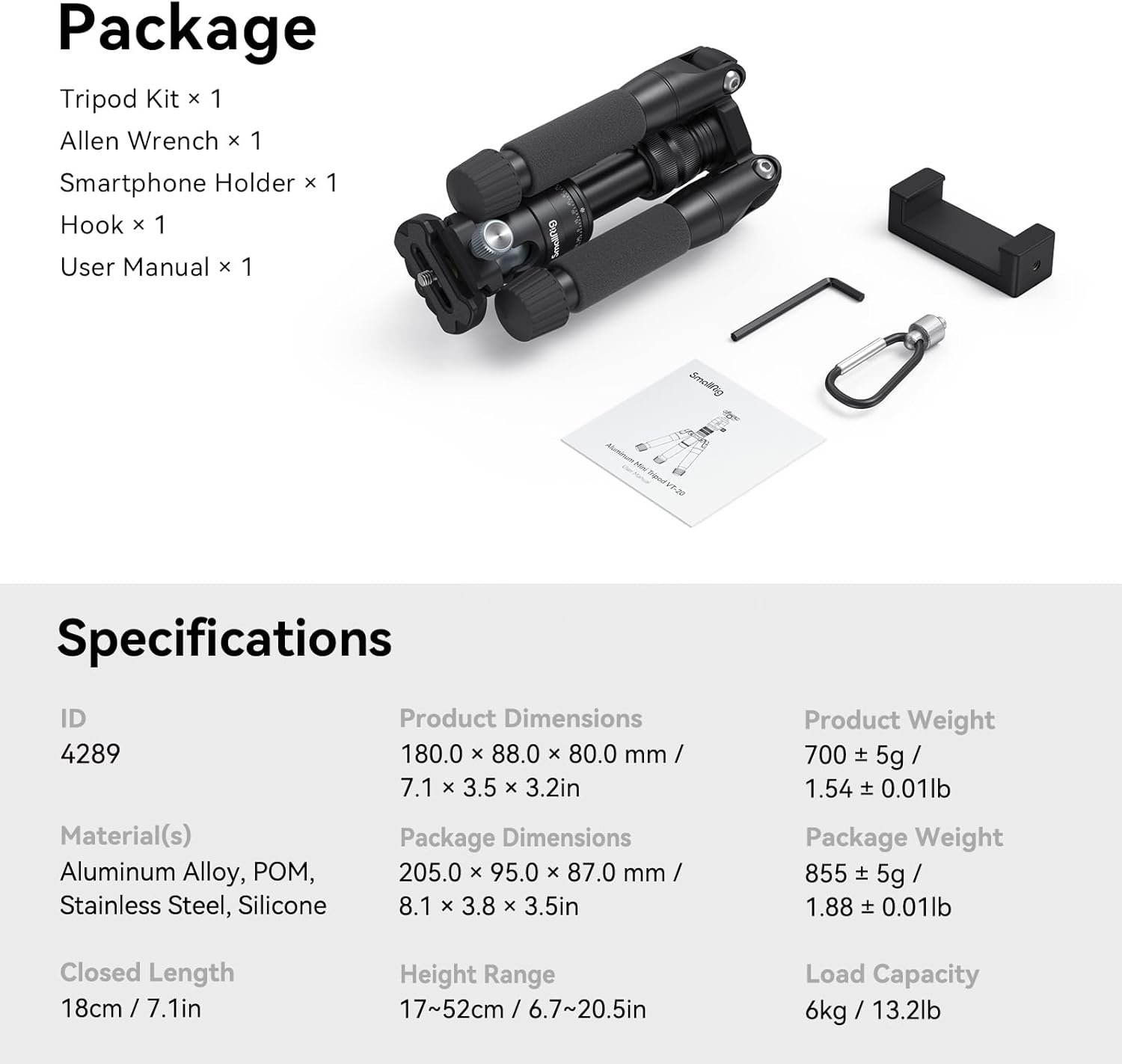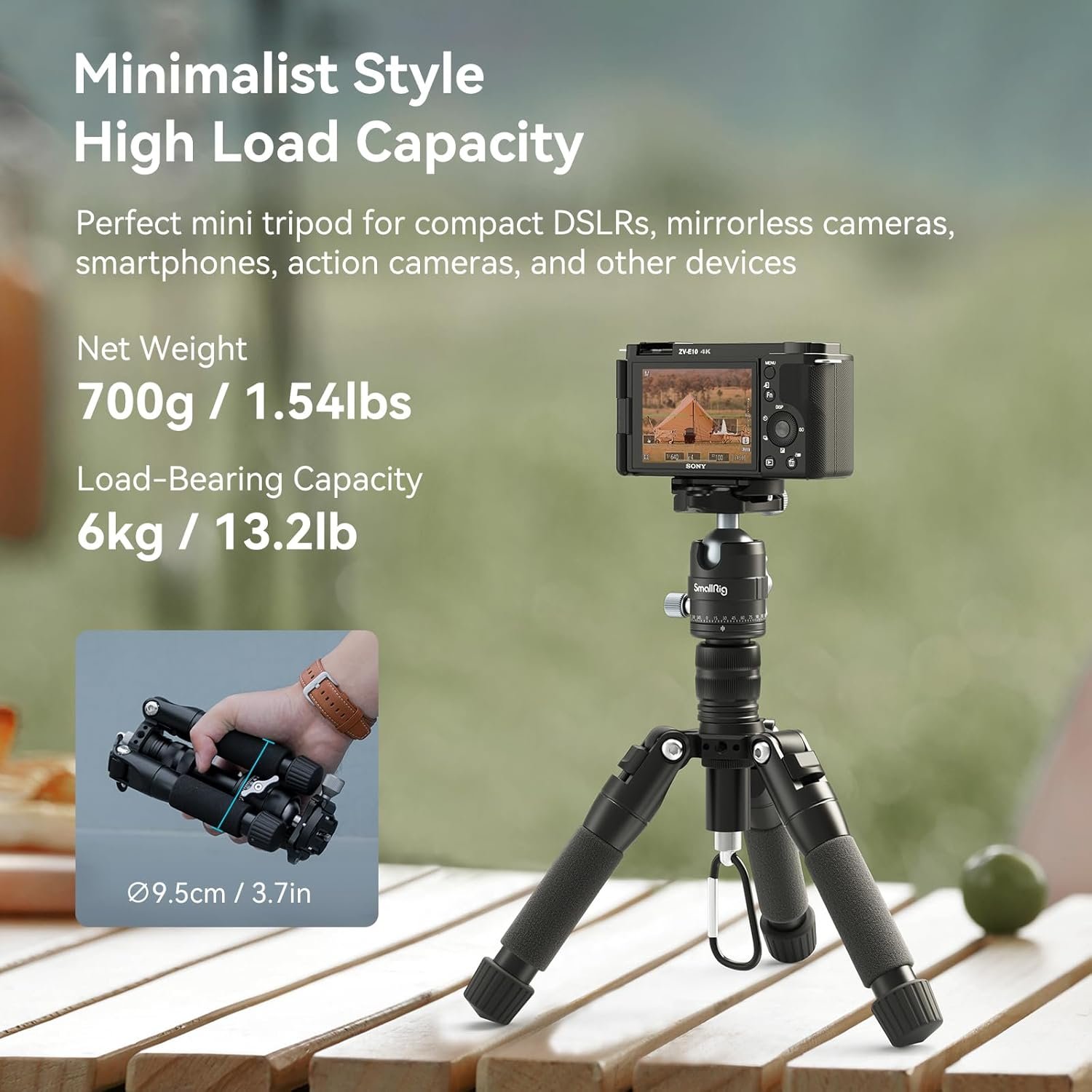 【Compact and Convenient】SmallRig Aluminum Mini Tripod VT-20 4289 is the perfect mini tripod for compact DSLRs, mirrorless cameras, smartphones, action cameras and other devices. Its foldable aluminum alloy legs and center column design allow for compact storage, making it only 18cm/7 inches in length and weighing under 700g/1.5lbs.