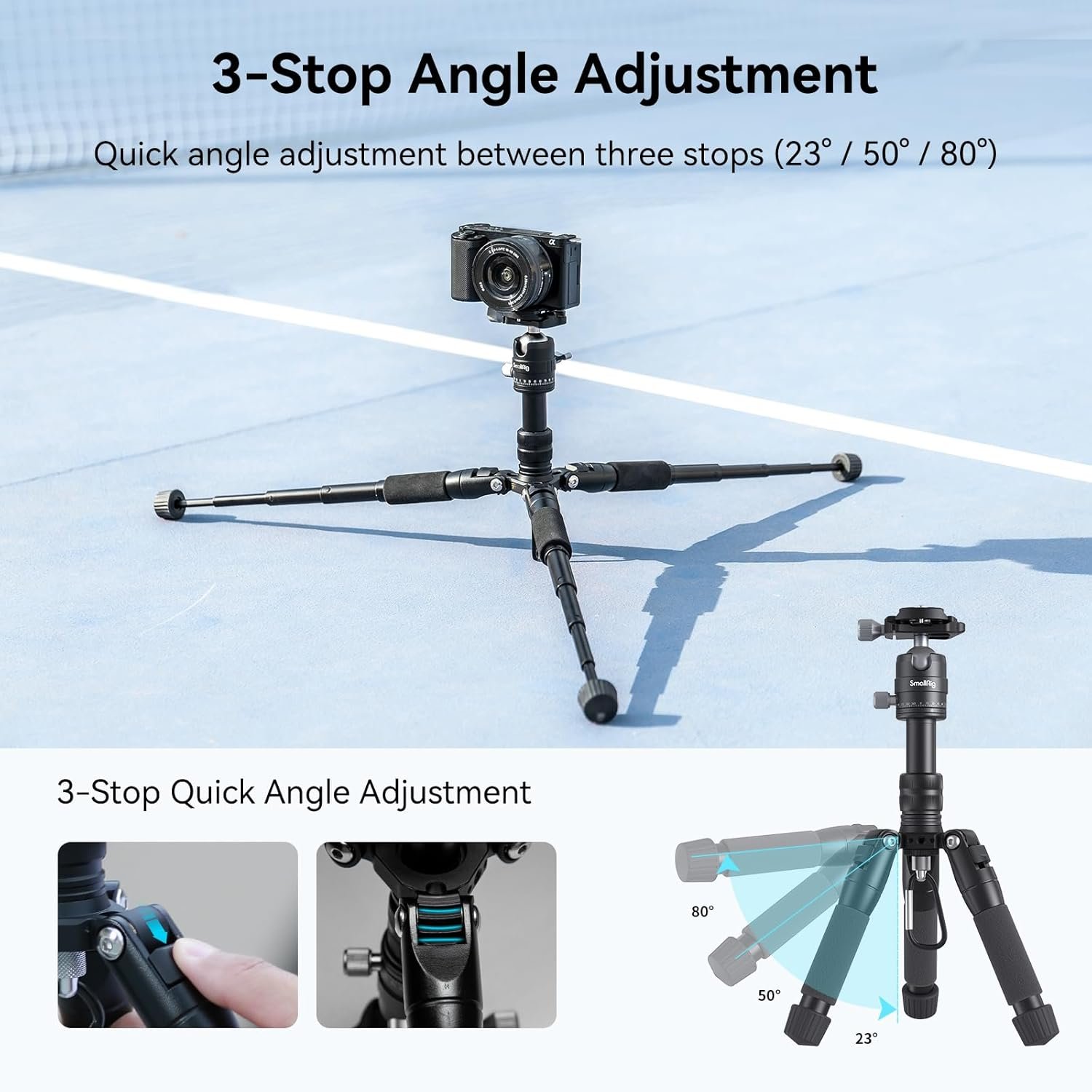 【Versatile Shooting Angles】The travel tripod has a quick angle adjustment lever, offering three angle options (23°/50°/80°) to meet different shooting angle demands. The center column can be disassembled and installed in reverse, providing more shooting perspectives.