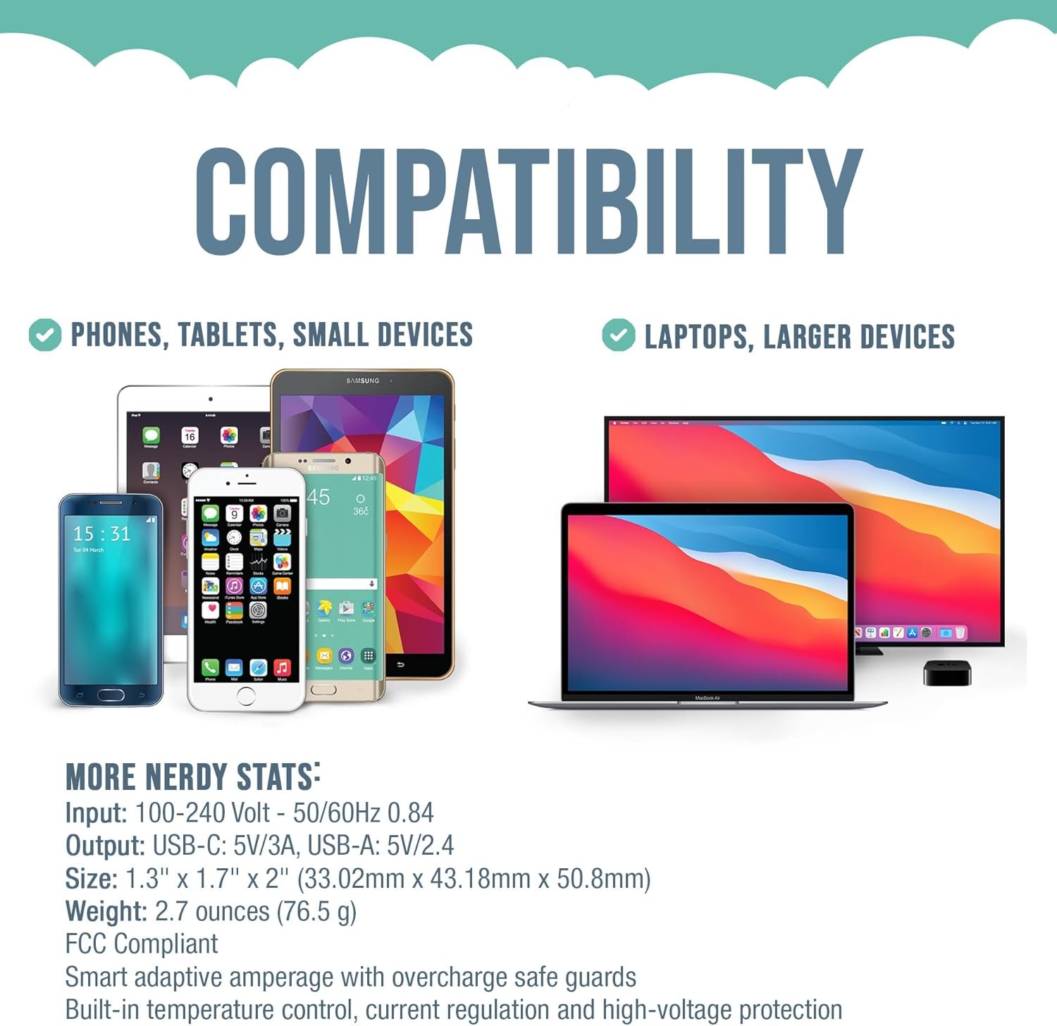 𝗠𝗢𝗥𝗘 𝗡𝗘𝗥𝗗𝗬 𝗦𝗧𝗔𝗧𝗦 – Input: 100-240 Volt; Output: Two USB-A Ports, 5 Volt, 2.4 amps per port, 4.8 amps total output; Size: 1.3″ x 1.7″ x 2″; Weight: 2.7 ounces; UL/FCC Compliant; Smart adaptive amperage with overcharge safeguards