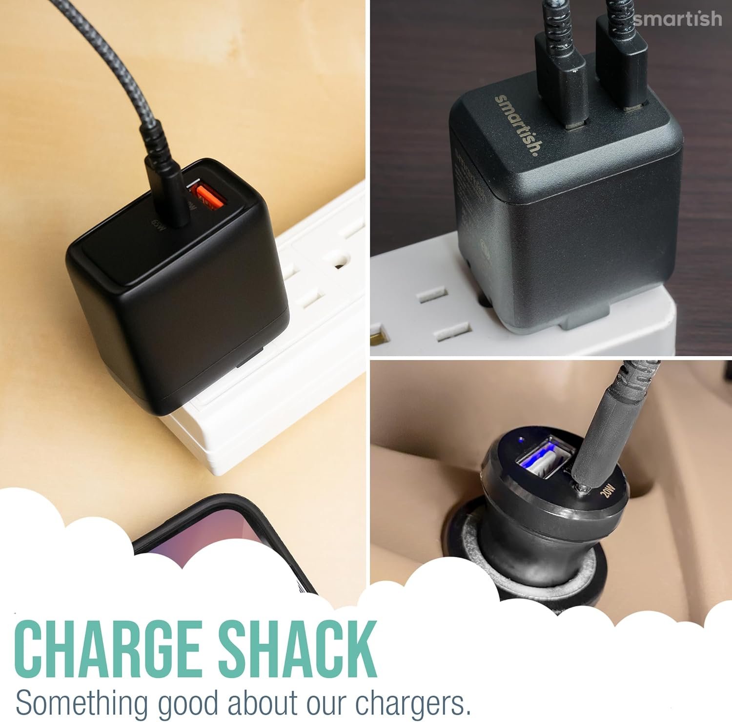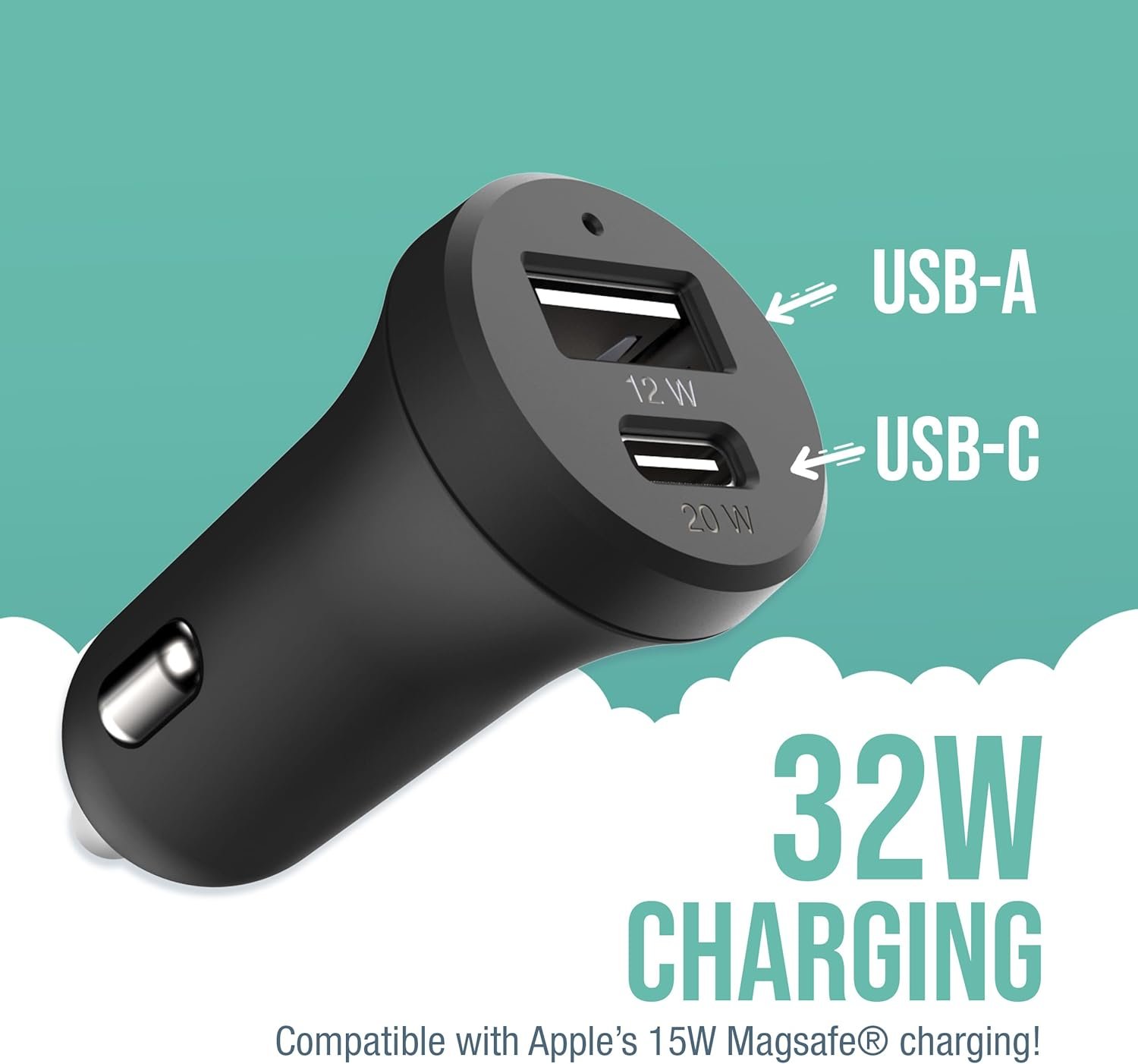 You see a faded sign on the side of the road that says fifteen miles to the CHARGE SHACK! With USB-A (12w) and USB-C (20w) ports, this little guy plugs into your car packing a 32w punch, which means it’s powerful enough for Apple’s 15w MagSafe charging. Charge Shack, Baby!