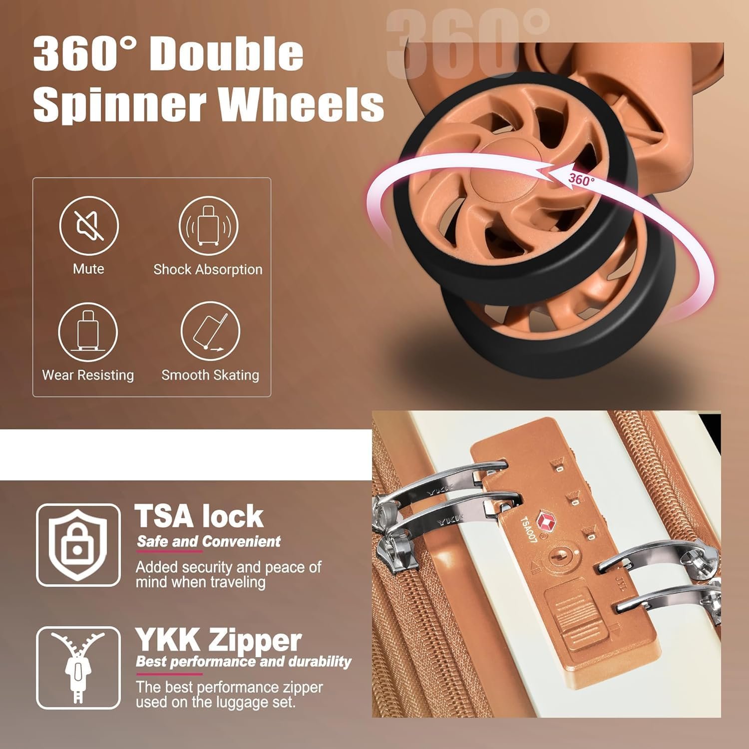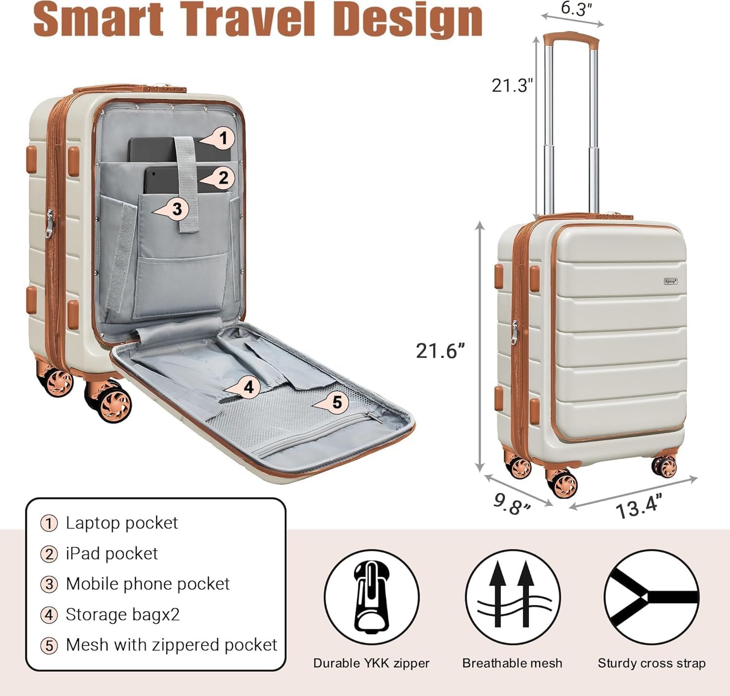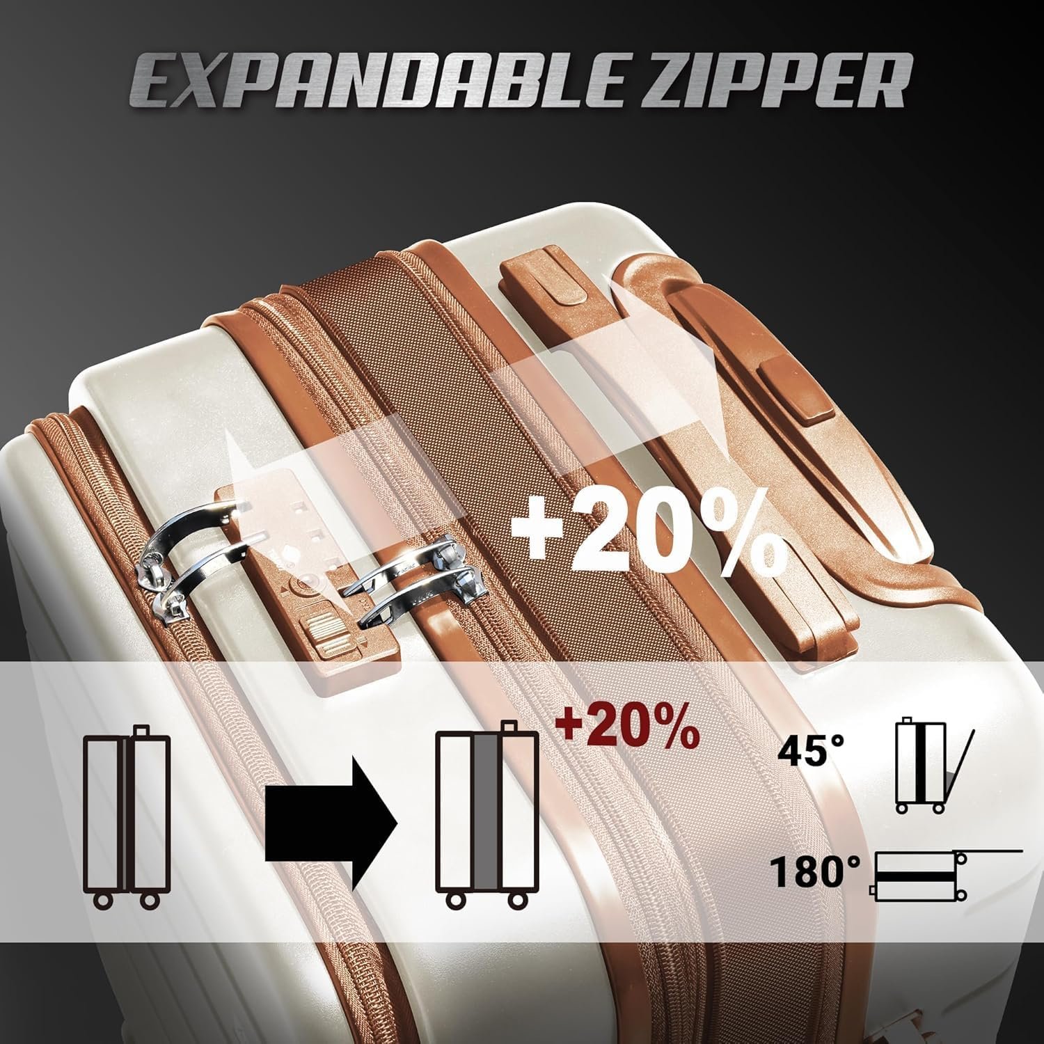 SmileLine 20 inch Carry-On Luggage Set with TSA Lock, Lightweight Hardside Suitcase with Spinner Wheels, Expandable Checked Luggage with Front Pocket, Bonus Travel Backpack & Makeup Bag, White-Brown