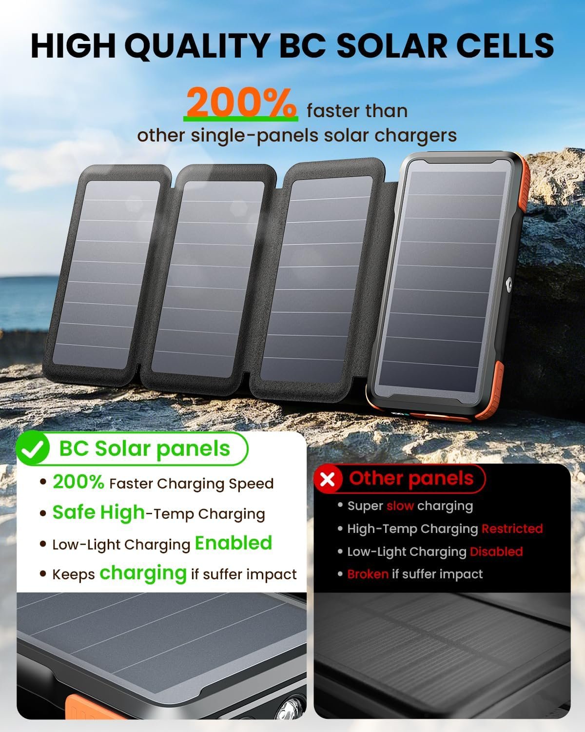 【Advanced BC Solar Panels】High-quality BC solar cells reduce heat buildup, significantly enhancing the durability of solar chargers. With no metal lines on the front, this design captures more sunlight and charges 200% more efficiently that of traditional solar panels. It operates effectively even under low-light conditions. A full day of sunlight can charge it up to a maximum of 8000mAh.