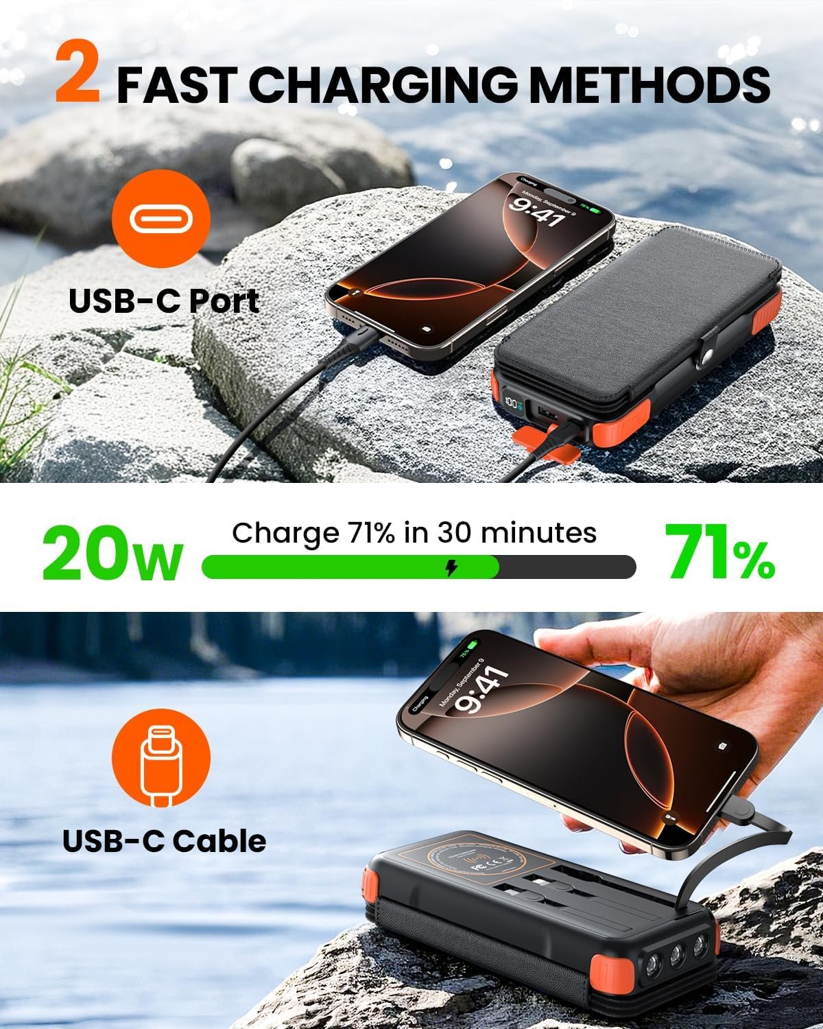 【PD 20W Fast Charging】Equipped with the advanced PD QC3.0 high-capacity fast charge technologies, boost an iPhone 16 from 0 to 70% in just 30 minutes. 3X quicker than a regular solar charger, our 20w solar power bank charge is faster, smarter, and safer.