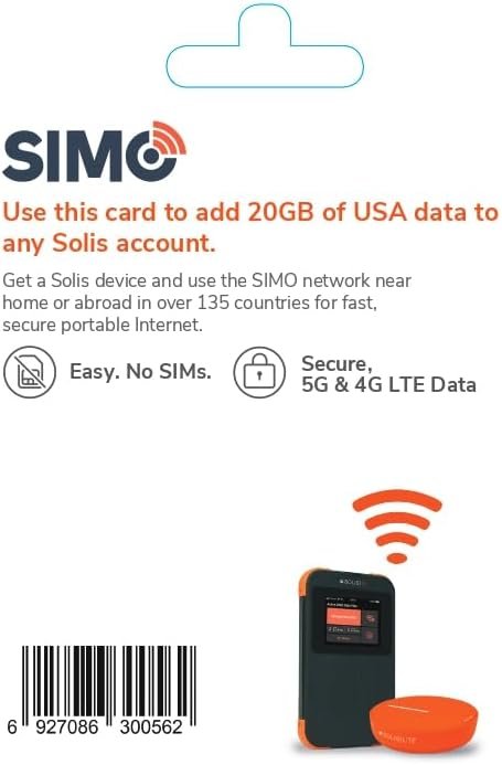 Use this card to add 20GBs of local USA data to your Solis Lite hotspot or Solis 5G Hotspot