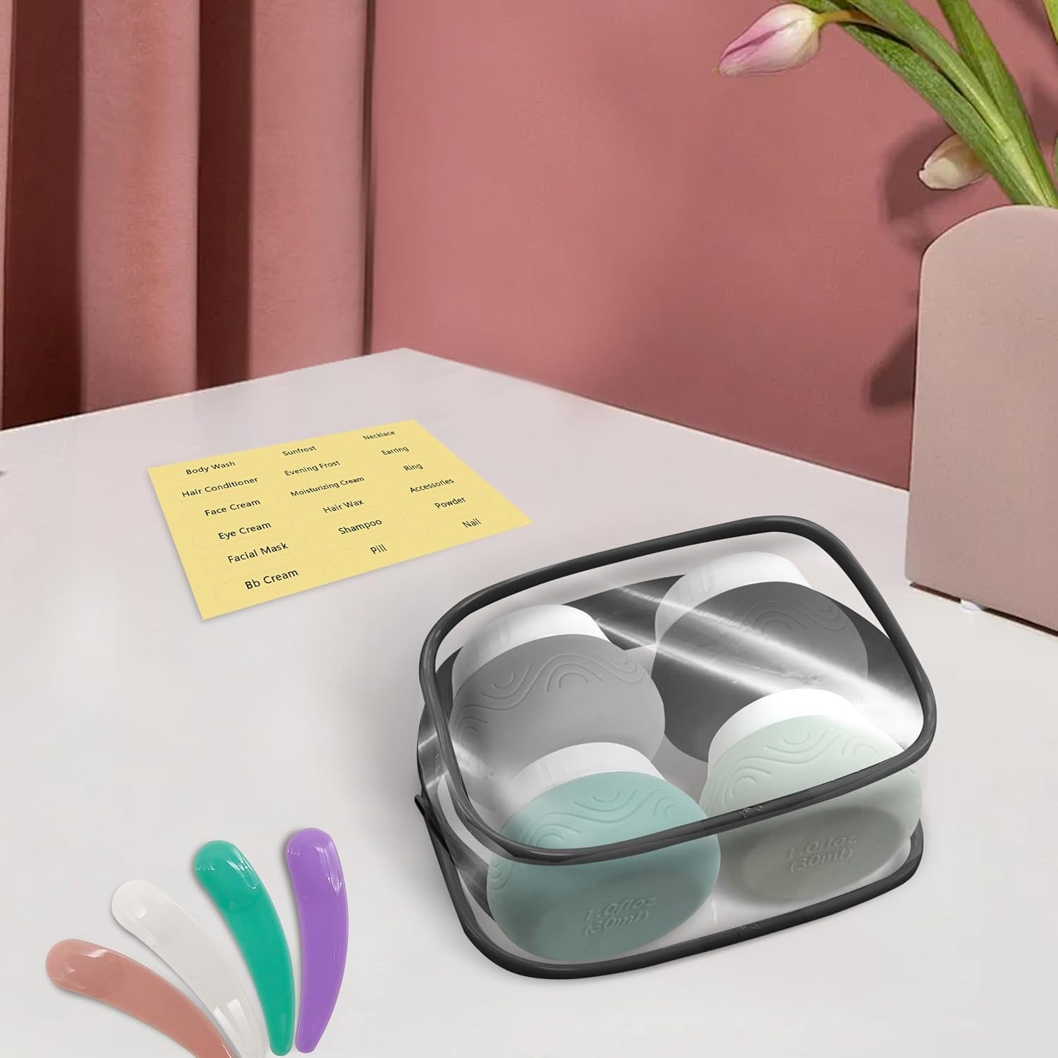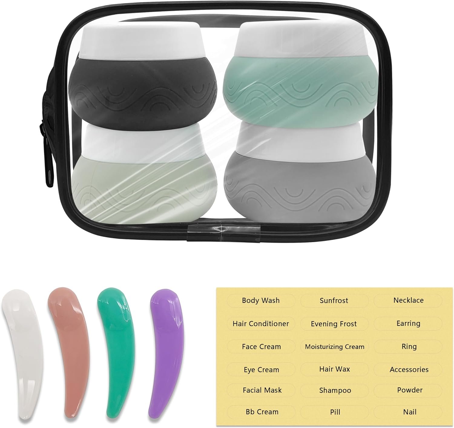 Designed for Travel Accessories: This set contains 4 portable travel containers for storing your lotions, Face Body Hand Cream etc, 4 small plastic spatulas for easy scooping, 18 water-proof labels for marking the contents for quick identification and avoid confusion, and 1 clear plastic zipper bag for keeping your products well organized in your luggage