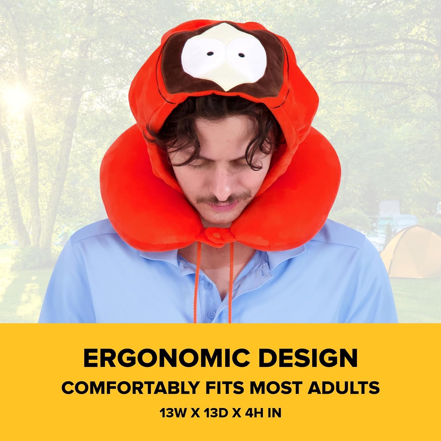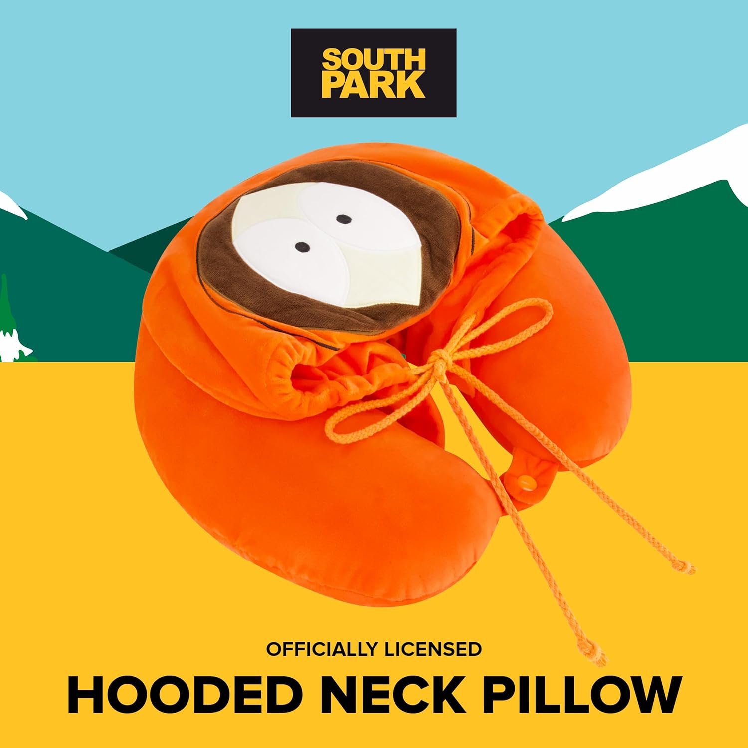 KENNY MCCORMICK HOODED NECK PILLOW: This unique and fun U-shaped travel pillow features the face of Kenny McCormick from South Park, complete with his iconic orange parka design. The attached hood provides added comfort and privacy during naps or long trips. Perfect for long car rides, airplane trips, plane journeys, or even lounging at home. This airline pillow also provides neck support during office breaks, while watching TV, or reading.