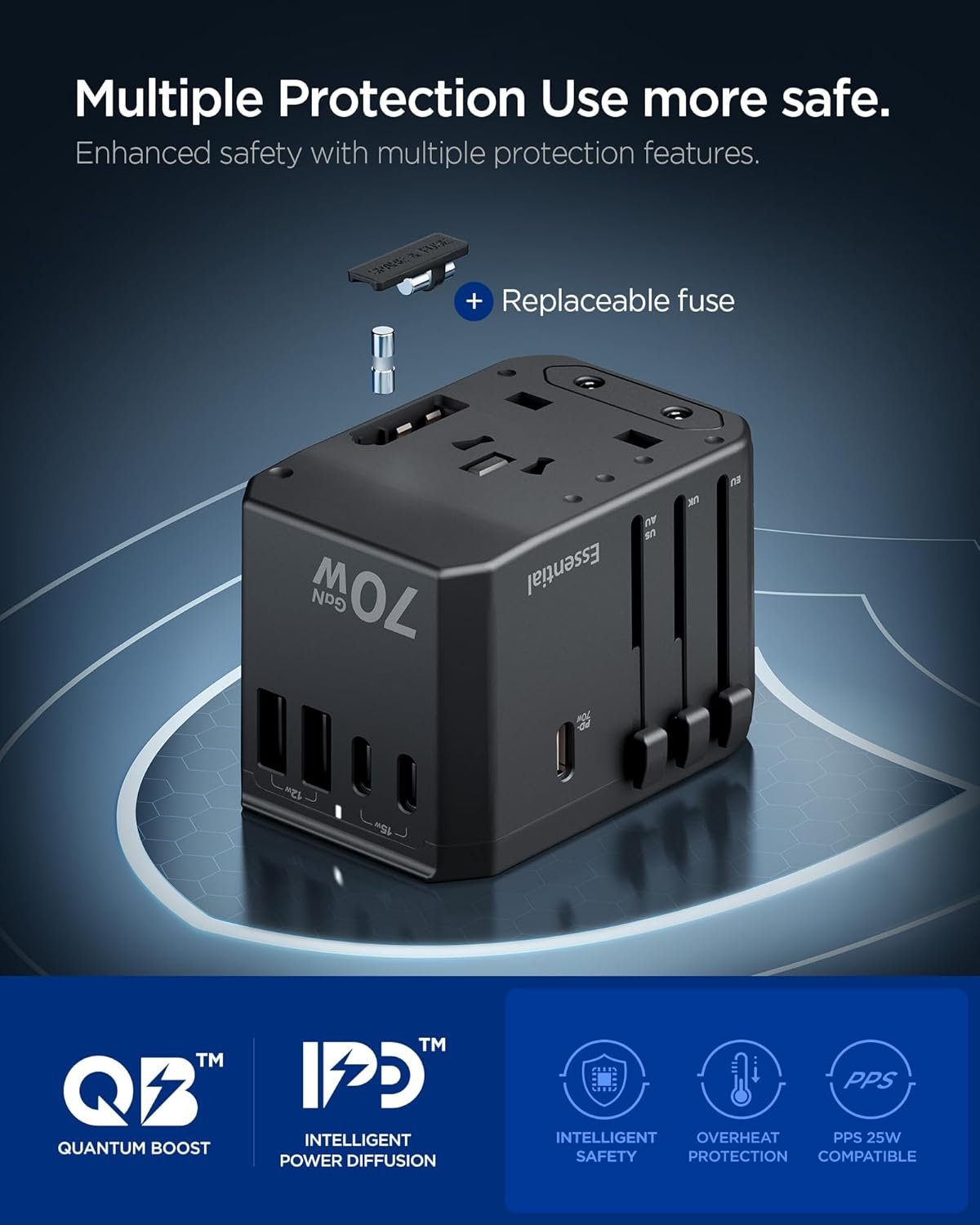 Universal and Versatile Travel Adapter: Covering UK (Type G), EU (Type C), AUS (Type I), and US(Type A)! With this adapter, enjoy your worldwide trip without worries for compatibility. Also enjoy total 2300W supported for the AC outlet for your various devices while traveling.