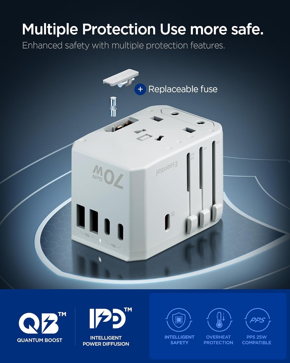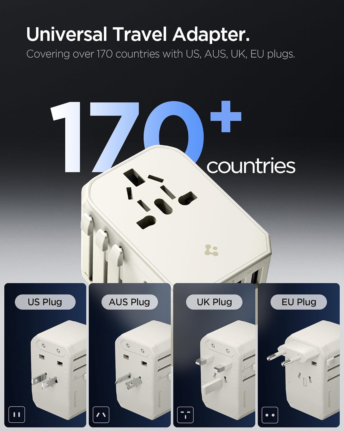 Universal and Versatile Travel Adapter: Covering UK (Type G), EU (Type C), AUS (Type I), and US(Type A)! With this adapter, enjoy your worldwide trip without worries for compatibility. Also enjoy total 2300W supported for the AC outlet for your various devices while traveling.