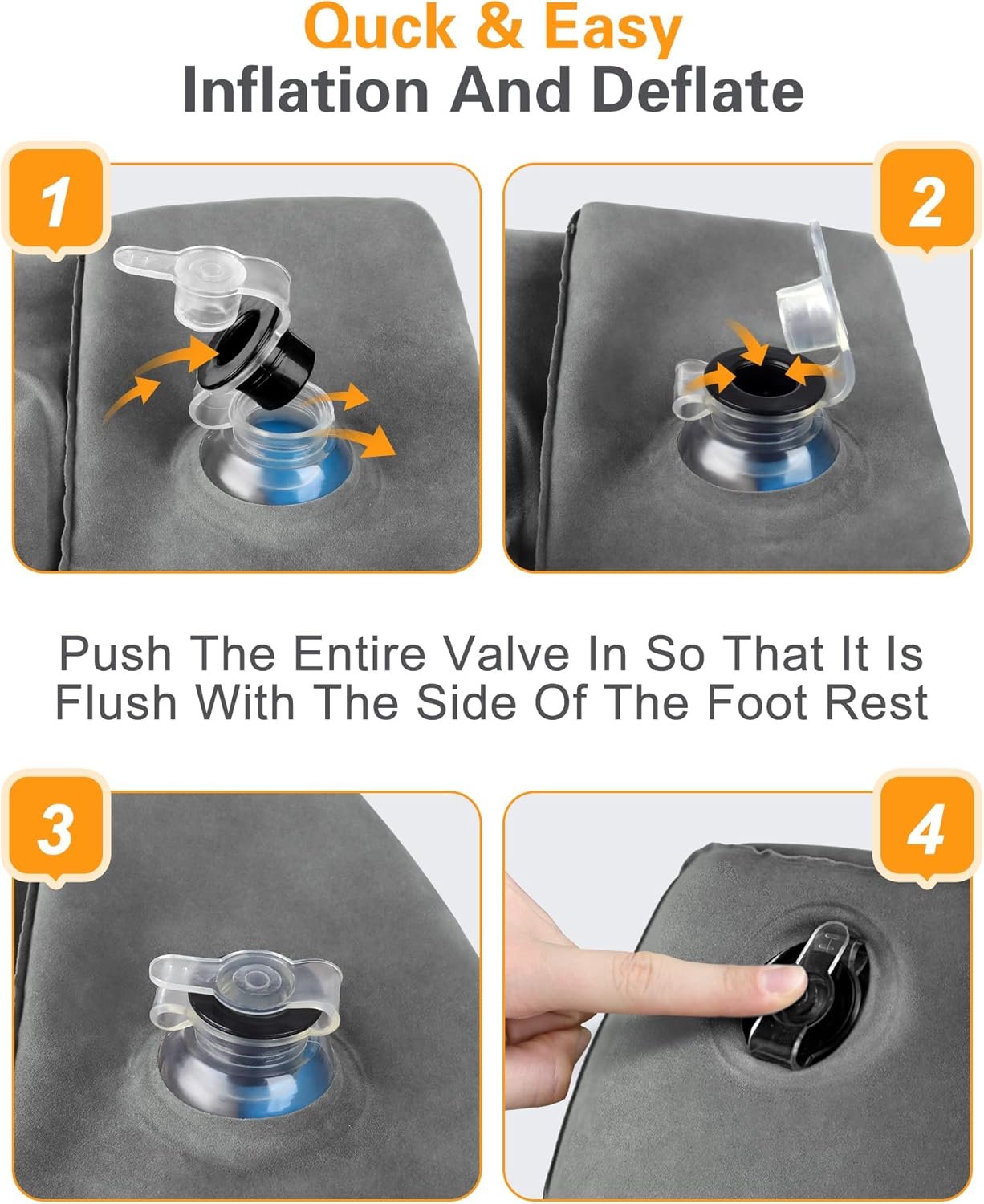 Very User-Friendly Design: Our inflatable foot rest pillow with 2-in-1 double valve,the upper black air valve is a one-way air inlet for inflating or replenishing gas.bottom transparent air valve can be quickly inflated and deflated,when you are done blowing it up, push clear cover on and push whole valve in so that it is flush with the side of the travel foot pillow,the airplane footrest takes away the hassle of bringing a pump and making noise in flight.