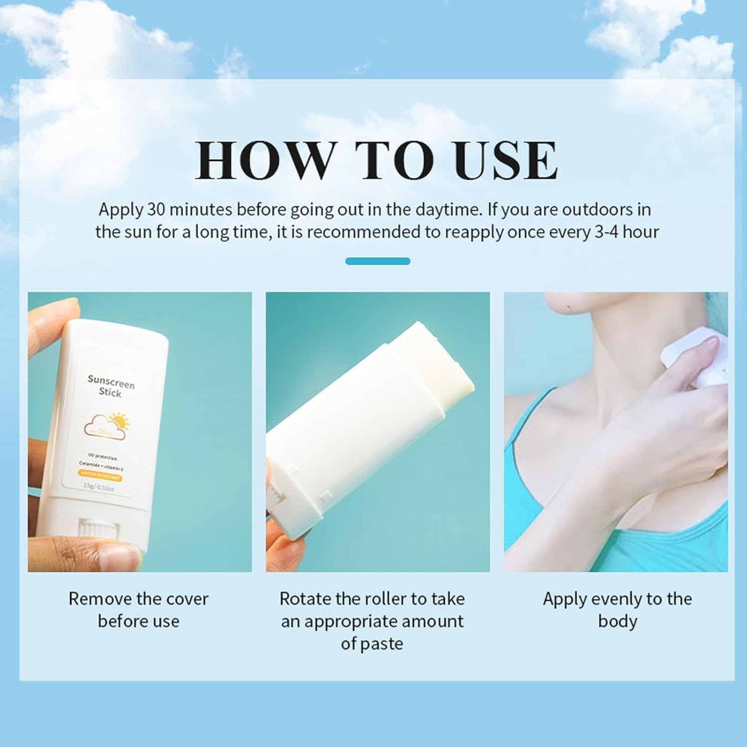 Sun screen stick is waterproof and sweat-resistant, maintaining a steady sun protection even after sweating or contact with water. This makes it especially suitable for use in hot and humid weather or when doing water activities, ensuring that the skin is always protected.