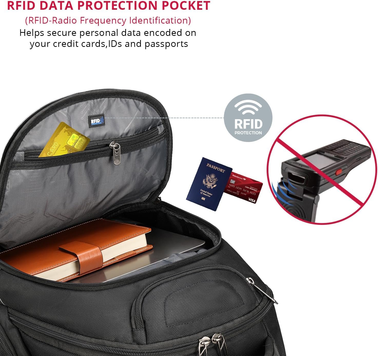 “RFID PROTECTION POCKET: RFID protection pocket protects your personal information from being stolen (e.g. credit cards, passports, and driver’s licenses) by an RFID scanner. It can be used as an everyday backpack, spacious college bookbag, professional backpack laptop toting or for everyday use anywhere life takes you—weekend getaways or for occasional travel purposes. “