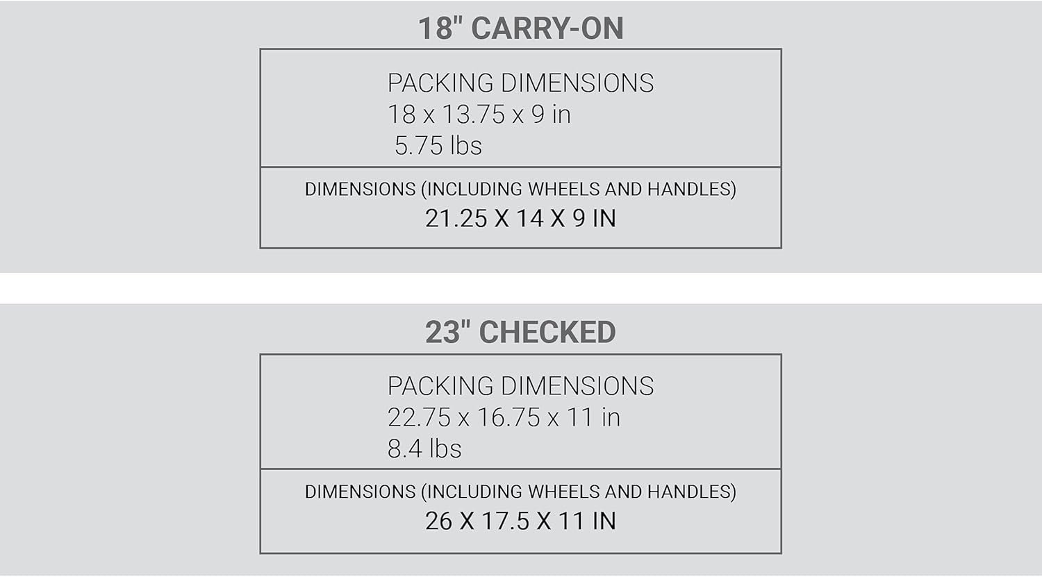 2-Piece Set Packing Dimensions: Carry-On – 18.5 x 13.75 x 9 in; Checked Luggage – 23” x 16.75” x 11