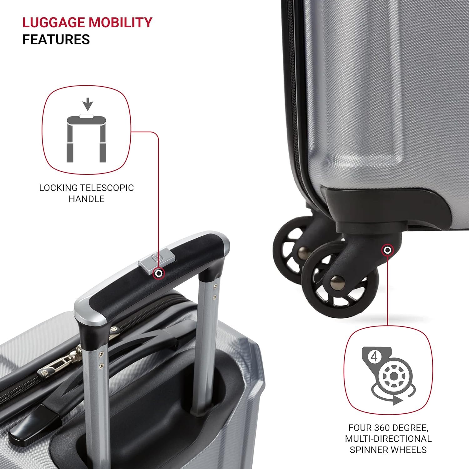 Durable Lift Handle: Durable molded top and side handle (carry-on features top handle only) makes for easy lifting and carrying of luggage.