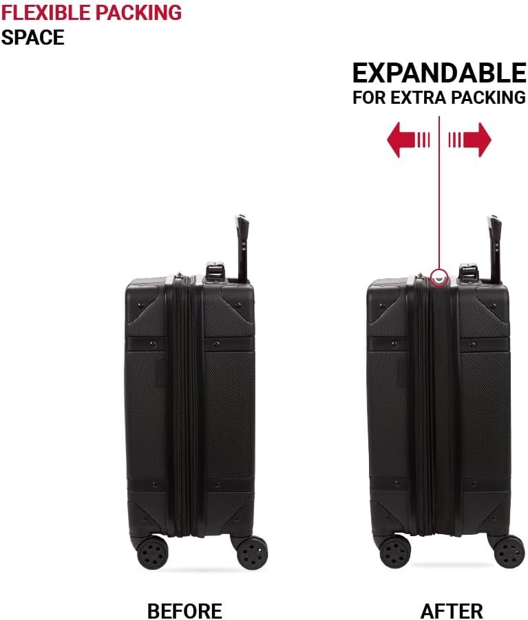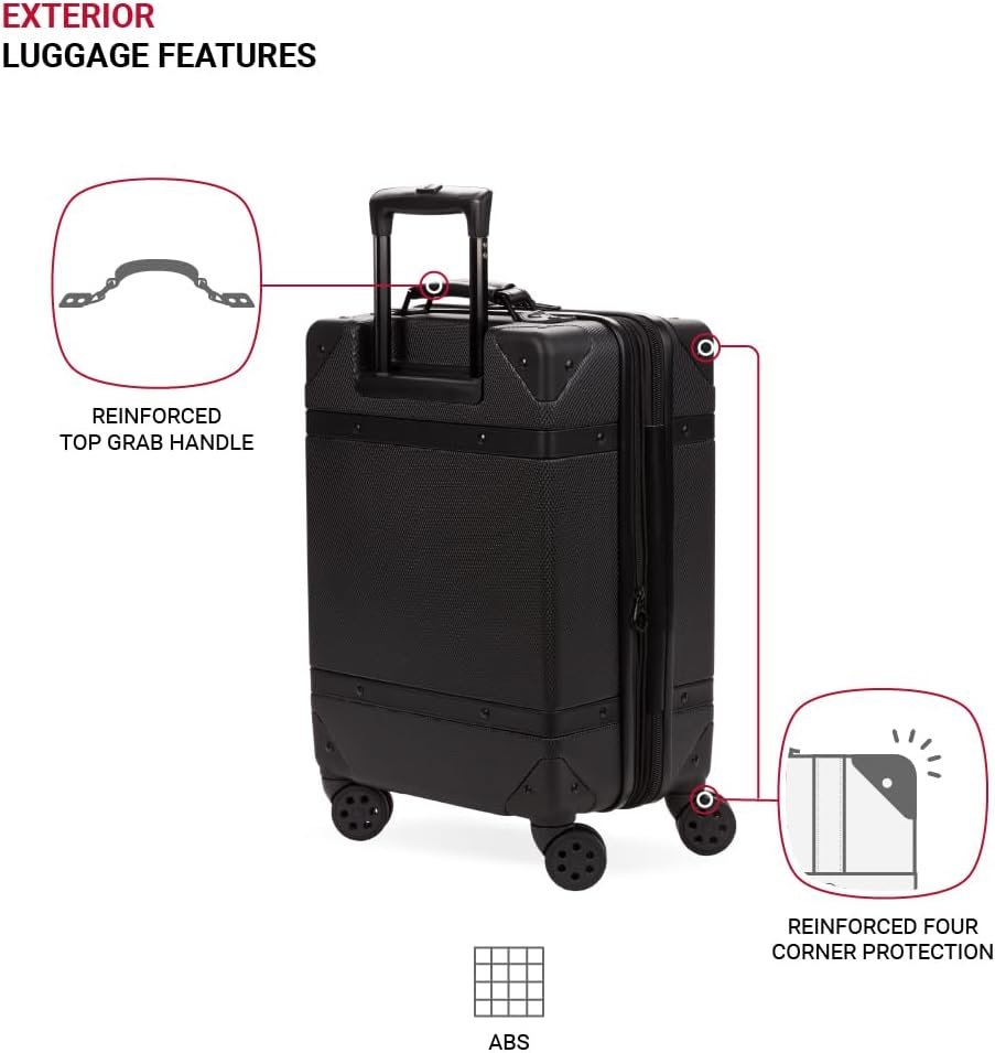 Upgrade your travel experience with the SwissGear 7739 19” Expandable Trunk Carry On Spinner. A split case design for better organization, this ABS constructed luggage can brace for hard impacts while its locking aluminum lift handle combined with 8 multi-directional spinner wheels allow for easy pushing or pulling of the case. Features include tie-down clothing straps to ensure stable transportation of your clothes, multiple interior packing pockets and a rugged grab handle for easy lifting.