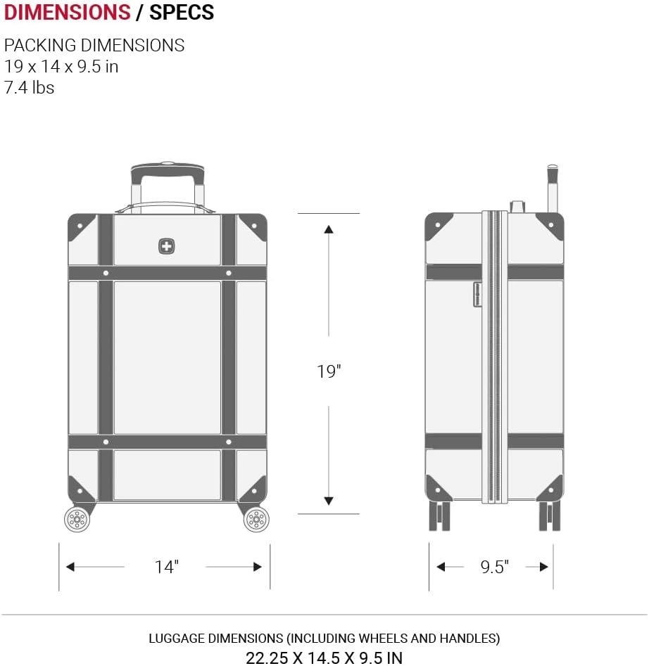 DIMENSIONS: Packing Dimensions: 19” x 14” x 9.5”; Product Dimensions (includes wheels and handles): 22.25” x 14.5” x 9.5”; Weight: 7.4 lbs.