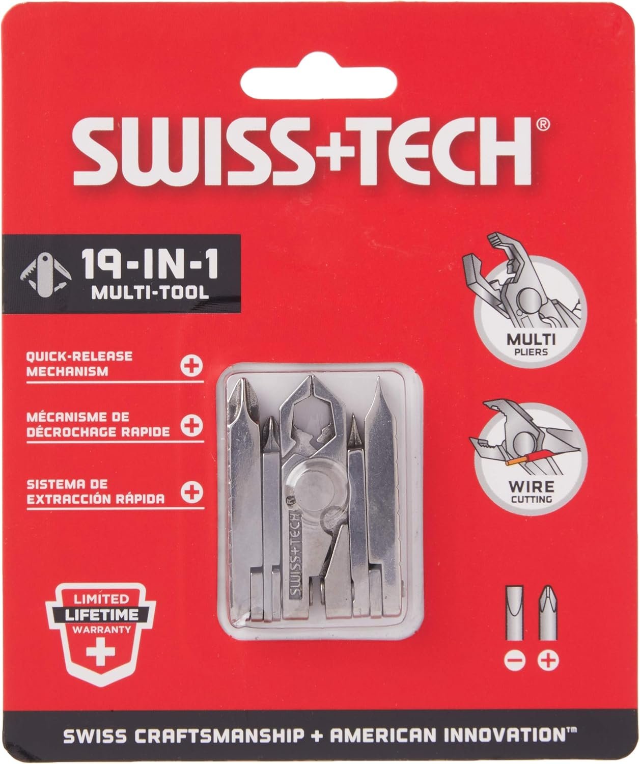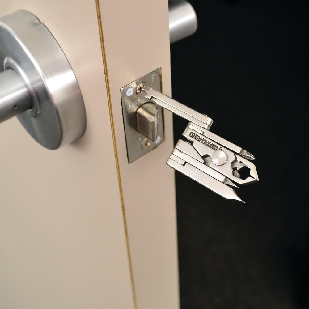The Swiss+Tech ST53100 19-in-1 Multitool Key is a compact and easily transportable tool with a patented quick-release and integrated locking system that attaches to any key ring. The multi keychain tool folds out into nineteen different professional-grade tools, giving you easy access to the tools you need when you need them. The 19-in-1 tool has everyday tools for everyday convenience. Tighten, loosen, wire, drill, file, open, and measure with ease. The Swiss-tech multi-tool includes two hex wrenches, three flathead screwdrivers, three Phillips head screwdrivers, pliers, a wire cutter, a wire stripper, a wire crimper, a nail file, a hand drill, a bottle opener, two rulers (one inch and one millimeter), and two ruler extensions (one inch and one millimeter). It’s ideal for use while camping or hunting, for auto repair, for installing hardware, and much more. Made of solid stainless-steel construction with a polished finish.