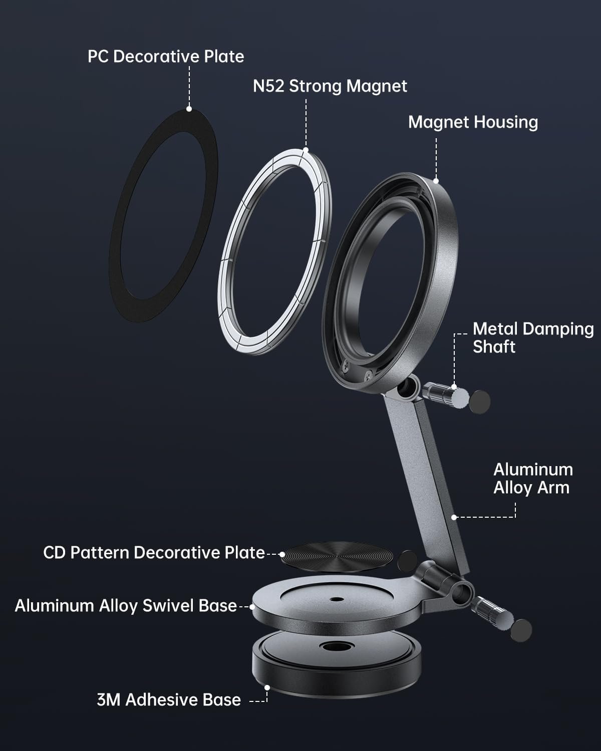 【High-quality Metal Craftsmanship】The magnetic car phone holder swivel arm is made of high-hardness aluminum alloy, which is processed by precision CNC. Compared with the all-plastic car holder, it is durable and not easy to deform. The surface adopts anodizing process, providing a delicate metal texture, which is both beautiful and durable.