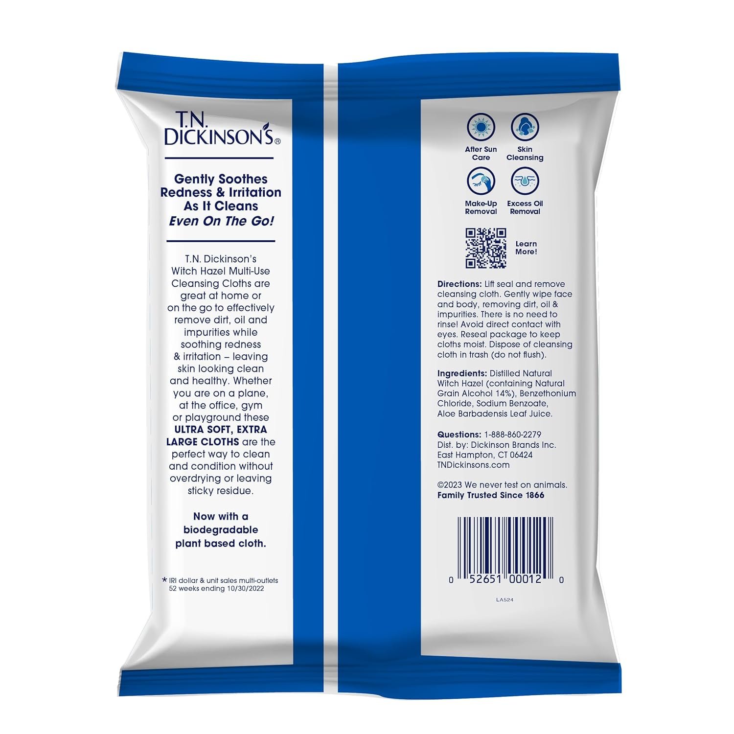Gentle cleansing, anytime, anywhere. T.N. Dickinson’s Witch Hazel Soothing Cleansing Cloths are designed for effective, on-the-go refreshment—removing dirt, oil, and impurities while soothing and balancing your skin. Infused with 100% natural USP witch hazel, these ultra-soft, extra-large cloths provide a gentle yet powerful cleanse without over-drying. Perfect for face and body, they’re a simple, effective solution for refreshing your skin at home, after workouts, or on the go. Free from artificial fragrances and dyes, dermatologist-tested, and made for all skin types, these cloths offer pure, natural care whenever you need it. Family-trusted since 1866, T.N. Dickinson’s has been committed to providing gentle and effective skin care solutions for generations. Wherever life takes you— There’s T.N. Dickinson’s for THAT.