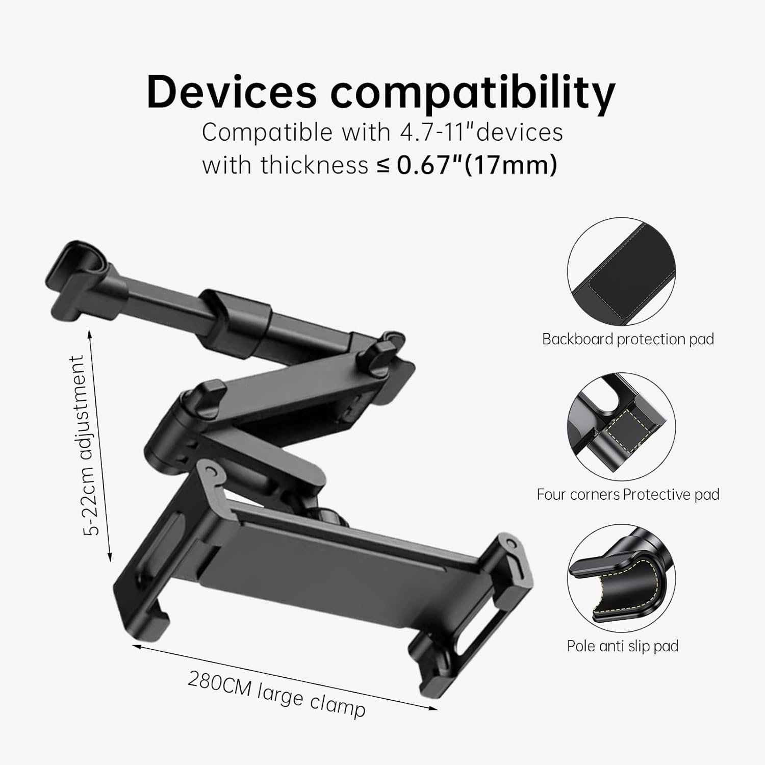 Wide Compatibility: tablet car mount headrest works with all 4-15 inch devices such as 2024 iPad Pro 13, 12.9, iPad Pro 11, iPad Pro 10.5, iPad Pro 10.2, iPad 9.7, 2022 iPad Air 5 4 3 2, iPad Mini 6 5 4 3 2, iPhone 15/14/13/12 Pro/Pro Max/Plus/Mini, iPhone XS/XS Max/XR/X 8 7 6 6s Plus, Kindle, Fire, Accessories, Galaxy Tab, for Switch, Smartphones and other devices.This car tablet holder mount fits most tablets and smartphones from