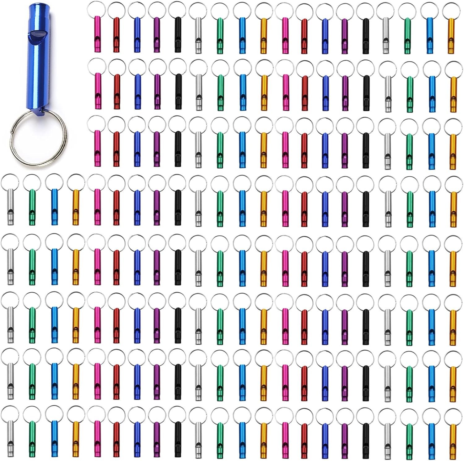 Package:You will receive 100 pieces mix colored Aluminum Whistles