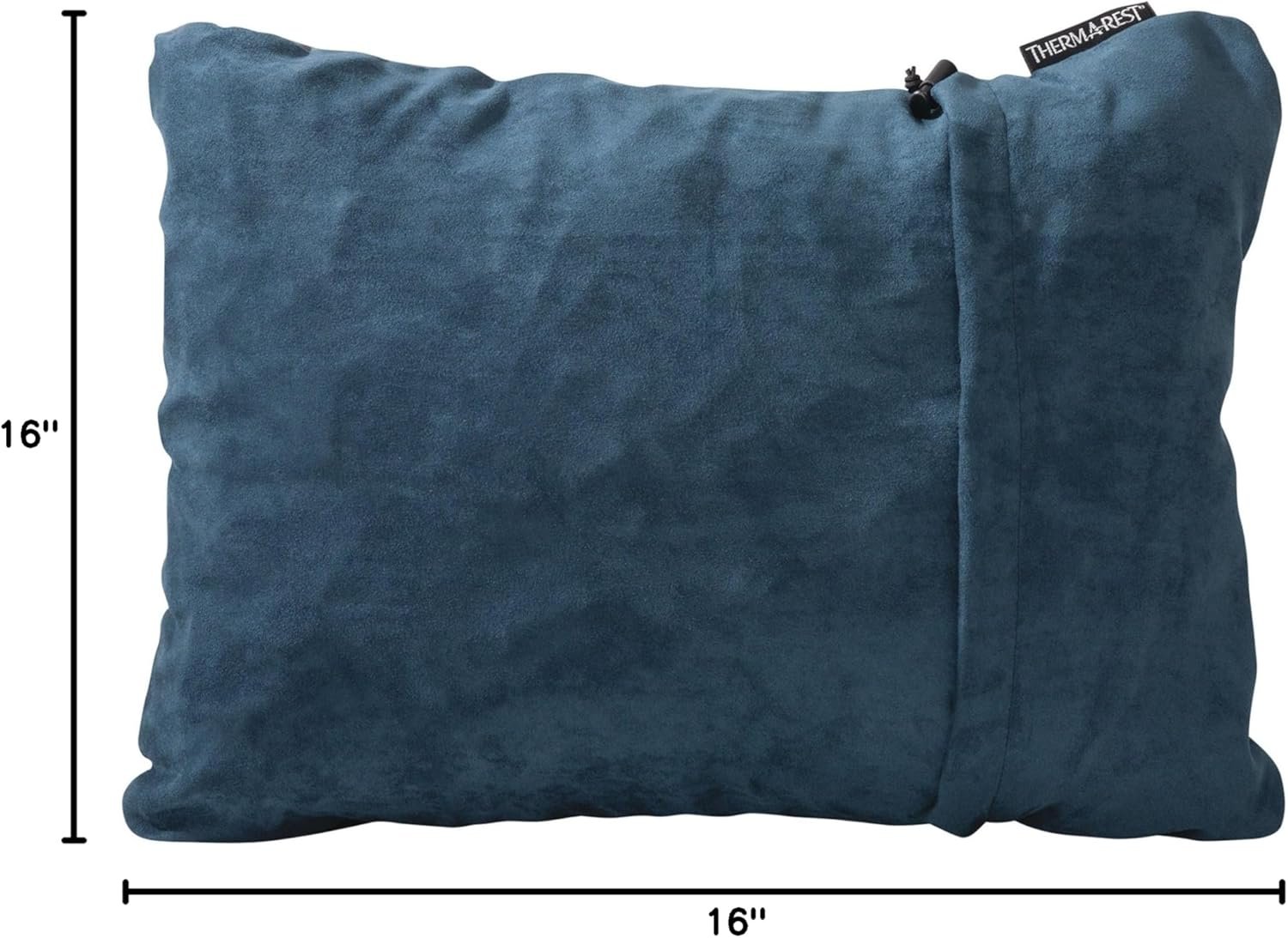 The Therm-a-Rest Compressible Travel Pillow is a true travel essential. Ideal for anyone seeking sleep and comfort on-the-go, it offers all the support of home bedding in a small, convenient, and lightweight package for camping, plane travel, car trips, backpacking, trekking, and festivals. Easily compressible for packing into a backpack, duffel, suitcase, or tote, the pillow expands into a 4-inch thick, soft and squishy pillow for head, neck, and back support. The brushed polyester cover is soft against skin for cozy comfort, promising sleep and relaxation in places where getting a little shut-eye can be a challenge. Rest comes even easier knowing that the lofty urethane filling is upcycled—the byproduct of Thermarest mattresses, utilizing the waste generated during production. The Therm-a-Rest Compressible Travel Pillow is available in four sizes: Small measures 12x16x4 inches expanded, 13x4x4 inches compressed, and weighs 7 ounces; Medium measures 14x18x4 inches expanded, 14x5x6 inches compressed, and weighs 9 ounces; Large measures 16x23x4 inches expanded, 16x7x7 inches compressed, and weighs 12 ounces; XL measures 16.5x27x4 inches expanded, 18x7x7 inches compressed, and weighs 15 ounces. Before use, shake and fluff pillow to restore loft. For maximum loft, machine wash and tumble dry. Made in the USA.