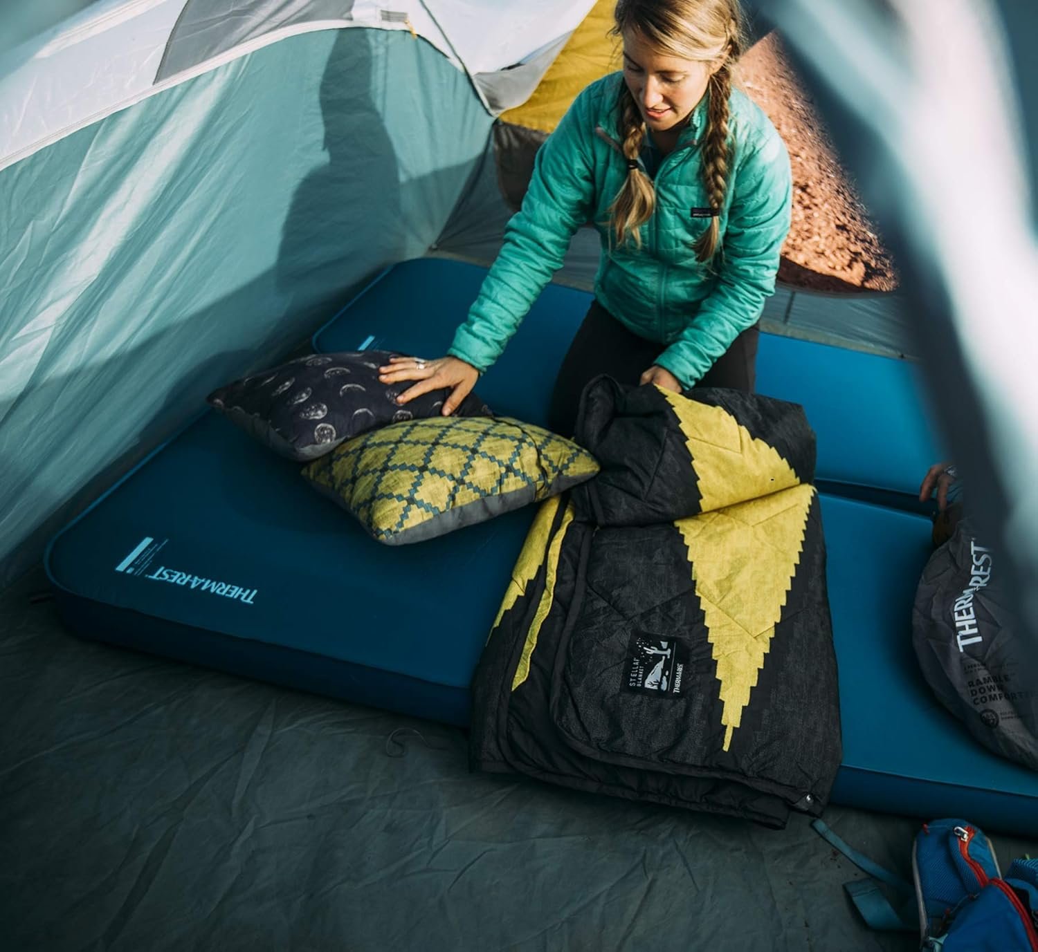 Brushed polyester cover is soft against skin for comfort; lofty urethane fill is an upcycled byproduct of Thermarest mattresses