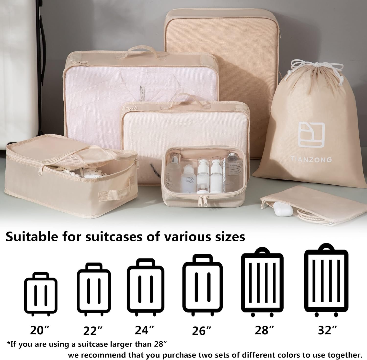 TianZong 7-piece Set Packing Cubes, Travel Bags for Luggage, Packing Organizers with Shoe Bag (Beige with a Toiletry Bag)