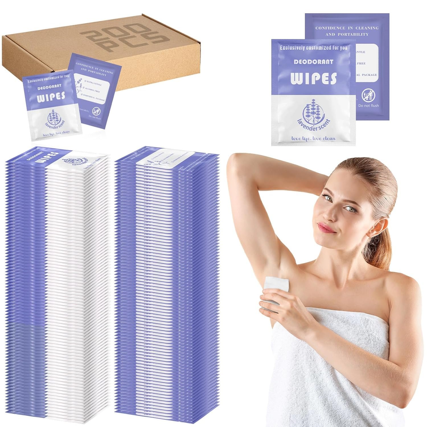 Timgle 200 Count Deodorant Wipes Individually Wrapped Underarm Deodorant Wipes Antiperspirant Wipes Body Wipes Remove Sweat Wipes for Men Women Travel and Daily Use Body Wipes(Purple)