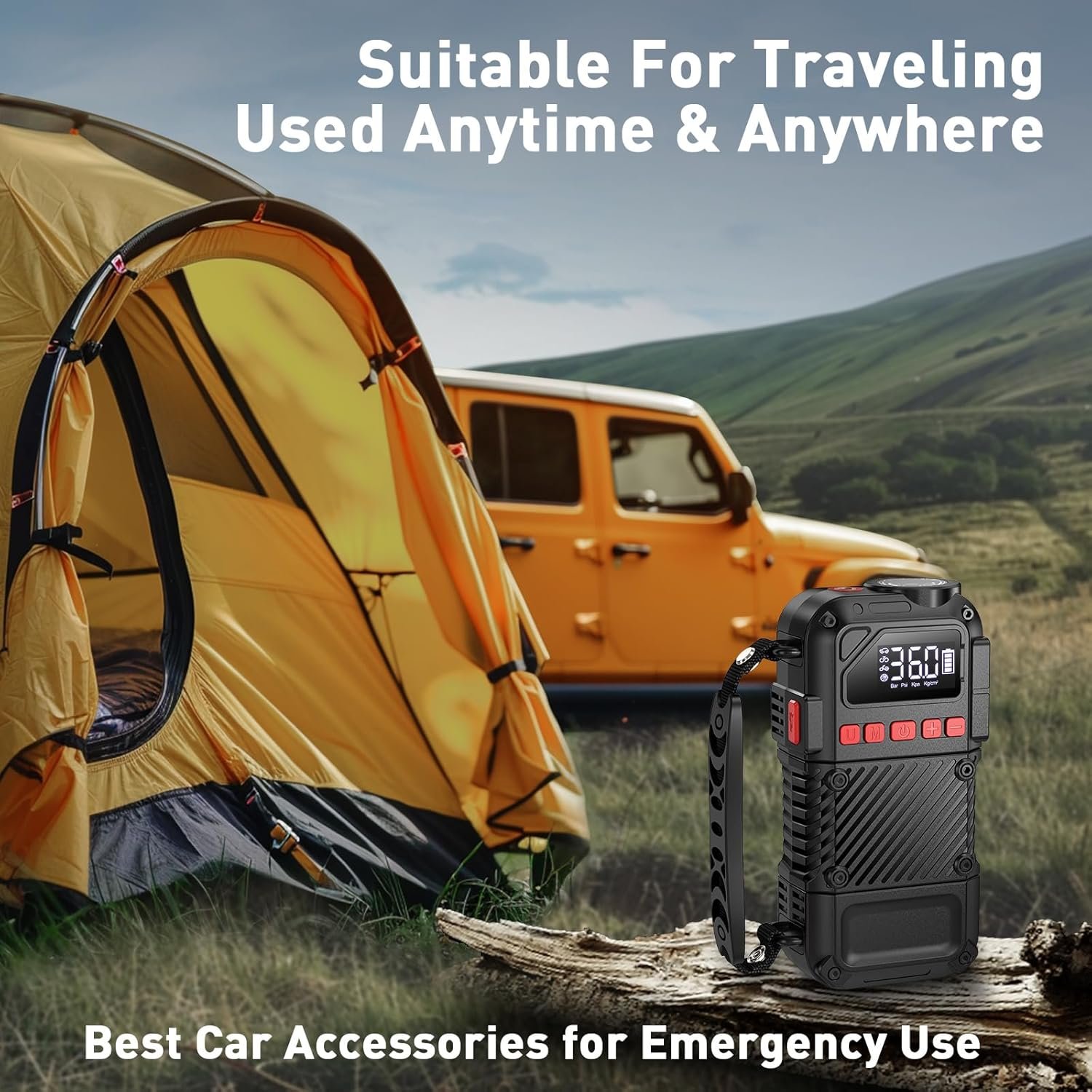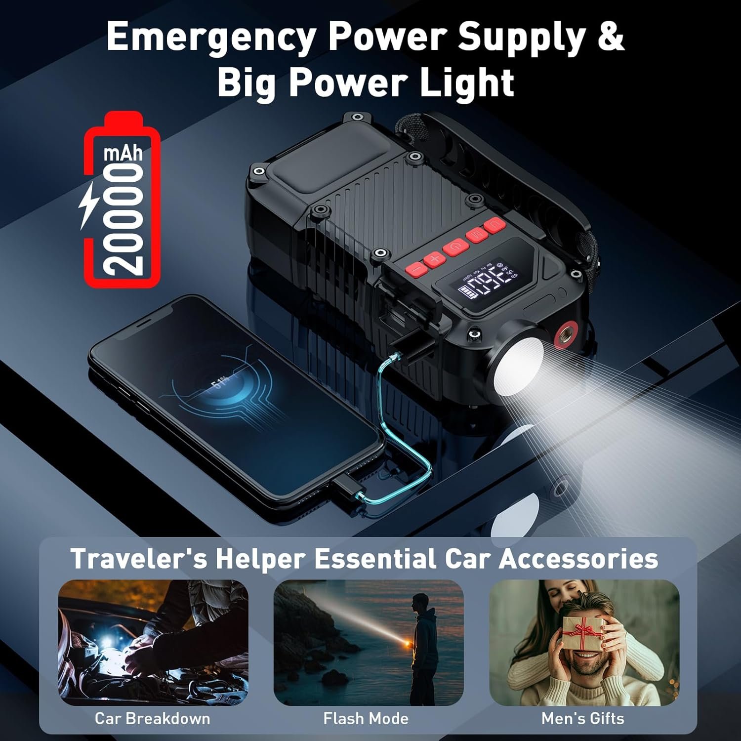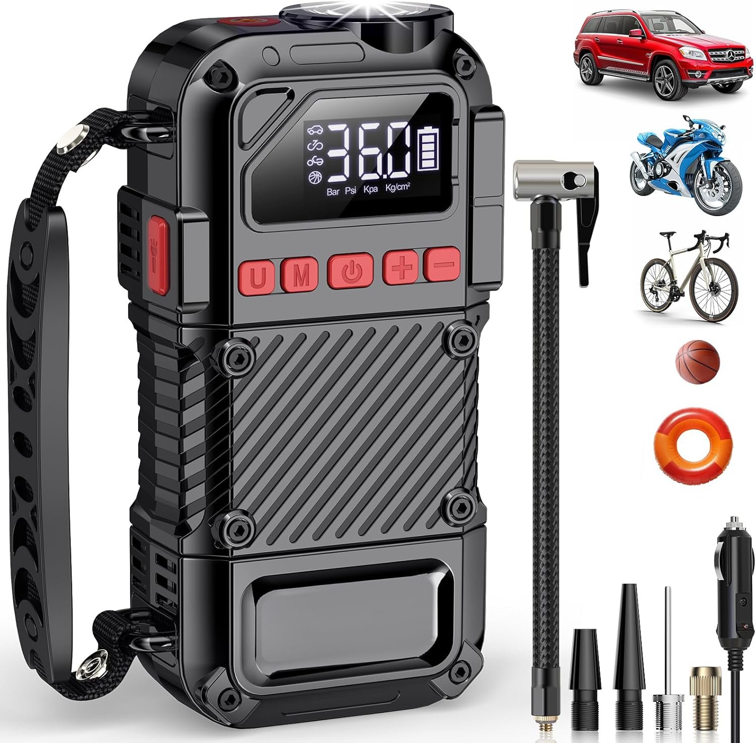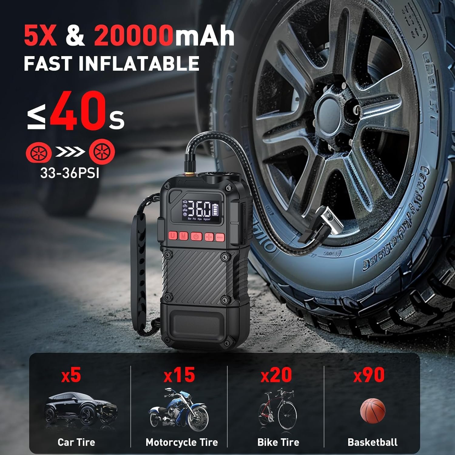 Battery 20000mAh &12DC inflatble:Portable tire inflator for car used 20000mAh rechargeable battery to inflate a variety of items, car tires, bike tires, swimming rings, sports balls and so on.Also you can use equipped car cigarette lighter when the battery is low and enjoy fast inflation.