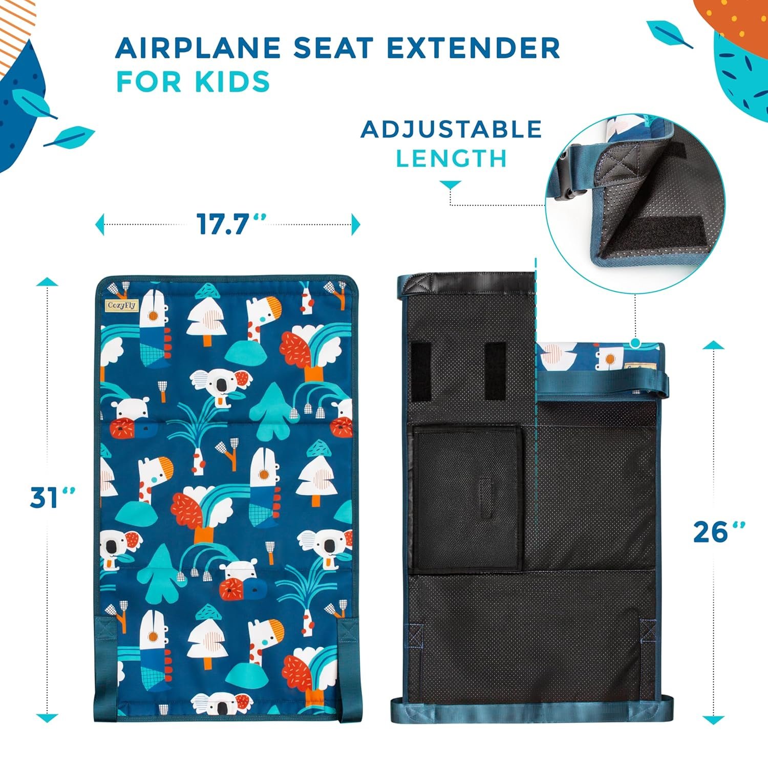 UNIVERSAL FIT and DESIGN- Perfect Travel Gift: Compatible with the most standard airplane seats. Our extender has adjustable velcro straps to accomodate various seat dimensions and configurations. Attractive jungle themed pattern suitable for both boys and girls. Please check whether the airline allows the use and installation and confirm the seat size before purchasing. Kids airplane seat extender can only be used next to window or middle row seats with seat trays but not on aisle seats, exit row seats. This airplane bed can’t support the full weight of the child.