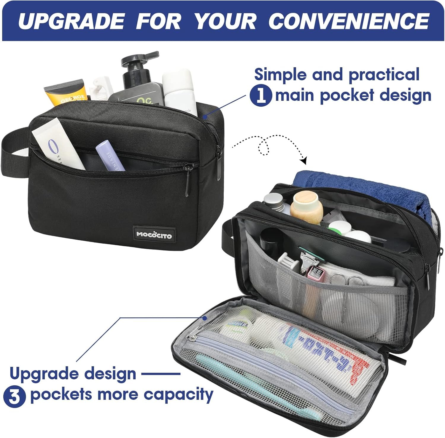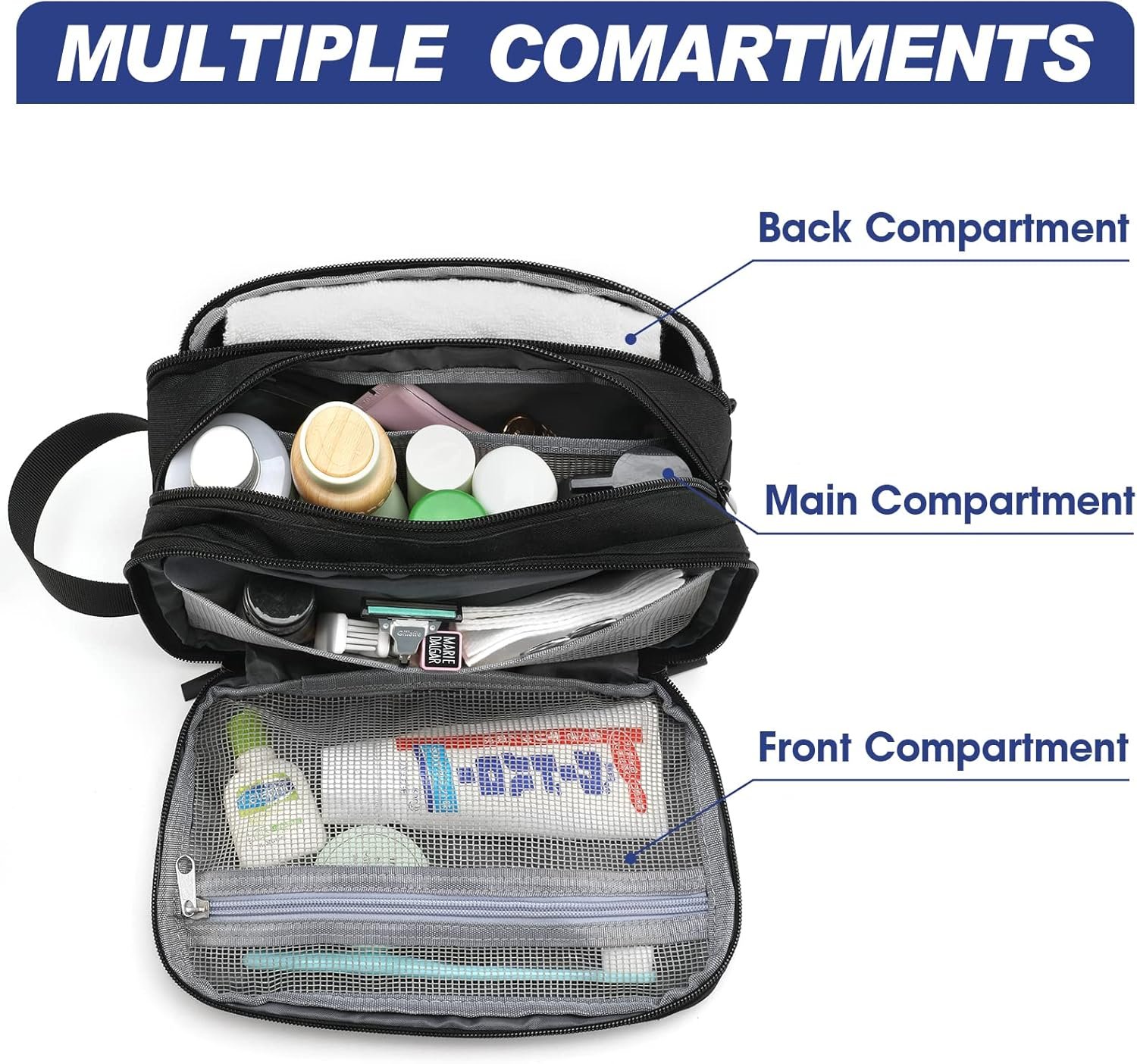 【Well-Organized Toiletry Bag】The main compartment of the toiletry bag holds larger items like bottles of shampoo or shaving cream. An inner mesh bag that keeps your smaller toiletries and cosmetics in a visible and breathable place. Another zippered back pocket provides additional storage with ease.