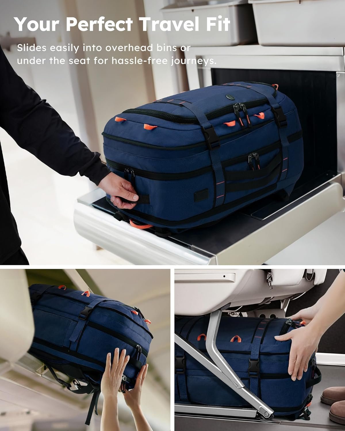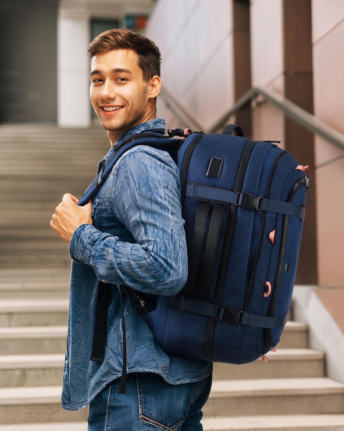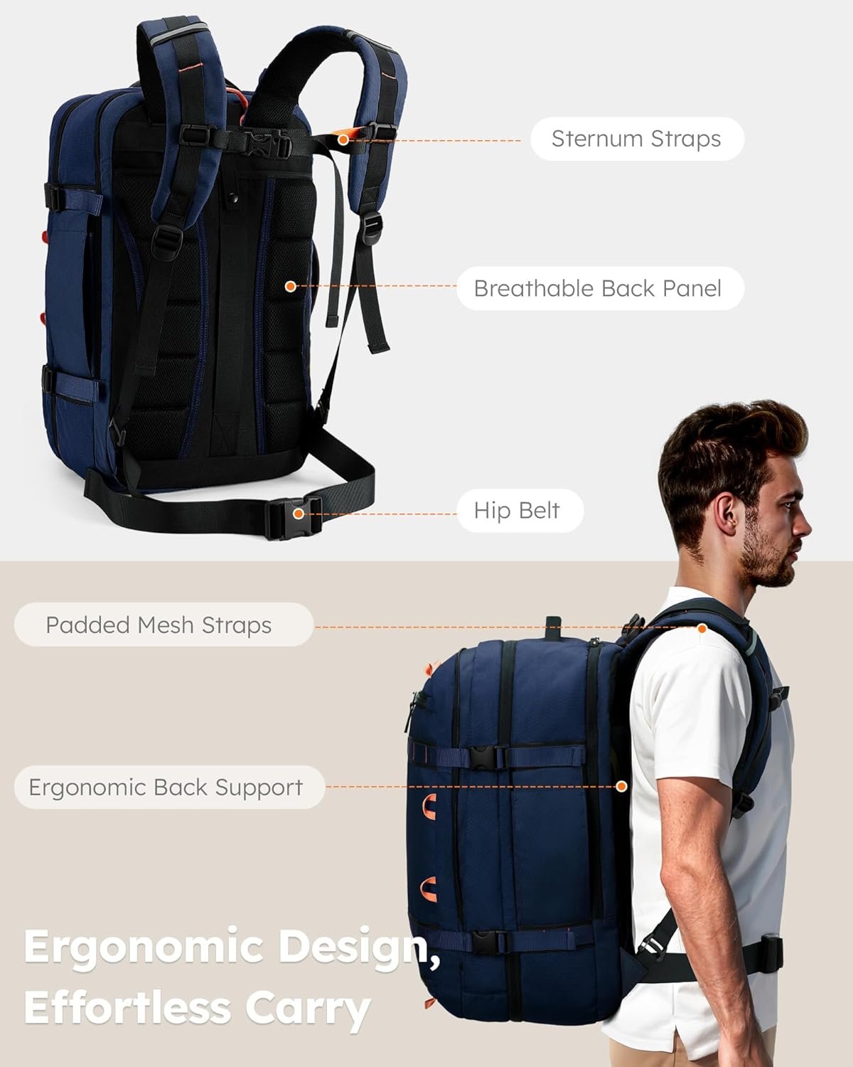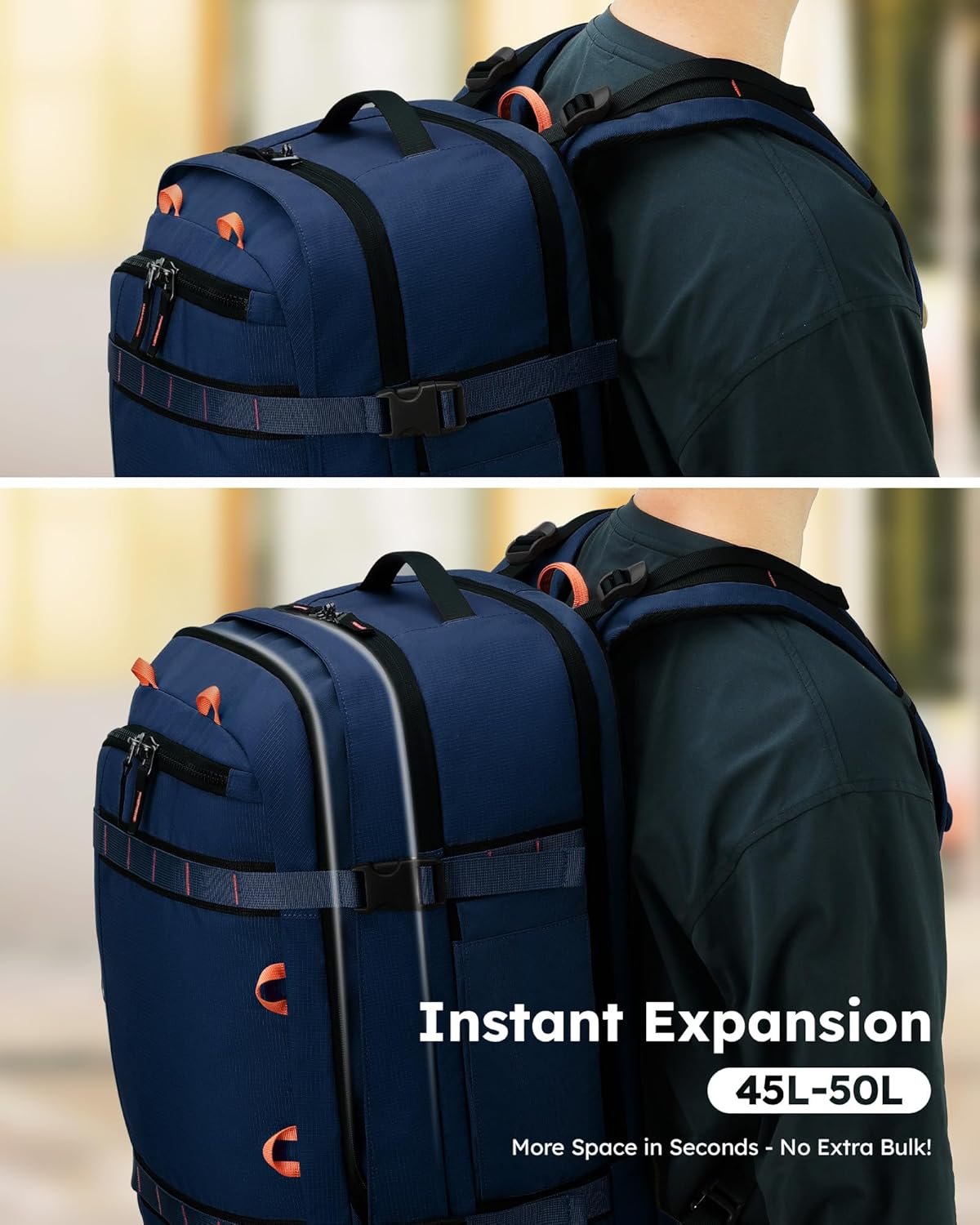 【TSA-Approved & Airline Friendly】Skip the hassle at security checks! The TSA-compliant 90-180° lay-flat design of carry on luggage backpack lets you breeze through airport screening. Compact yet spacious (21.65″x12.99″x11.22″), it fits overhead bins, helping you avoid extra baggage fees. The personal item travel backpack is expandable from 45L to 50L, perfect for 3-5 day trips without bulky luggage.