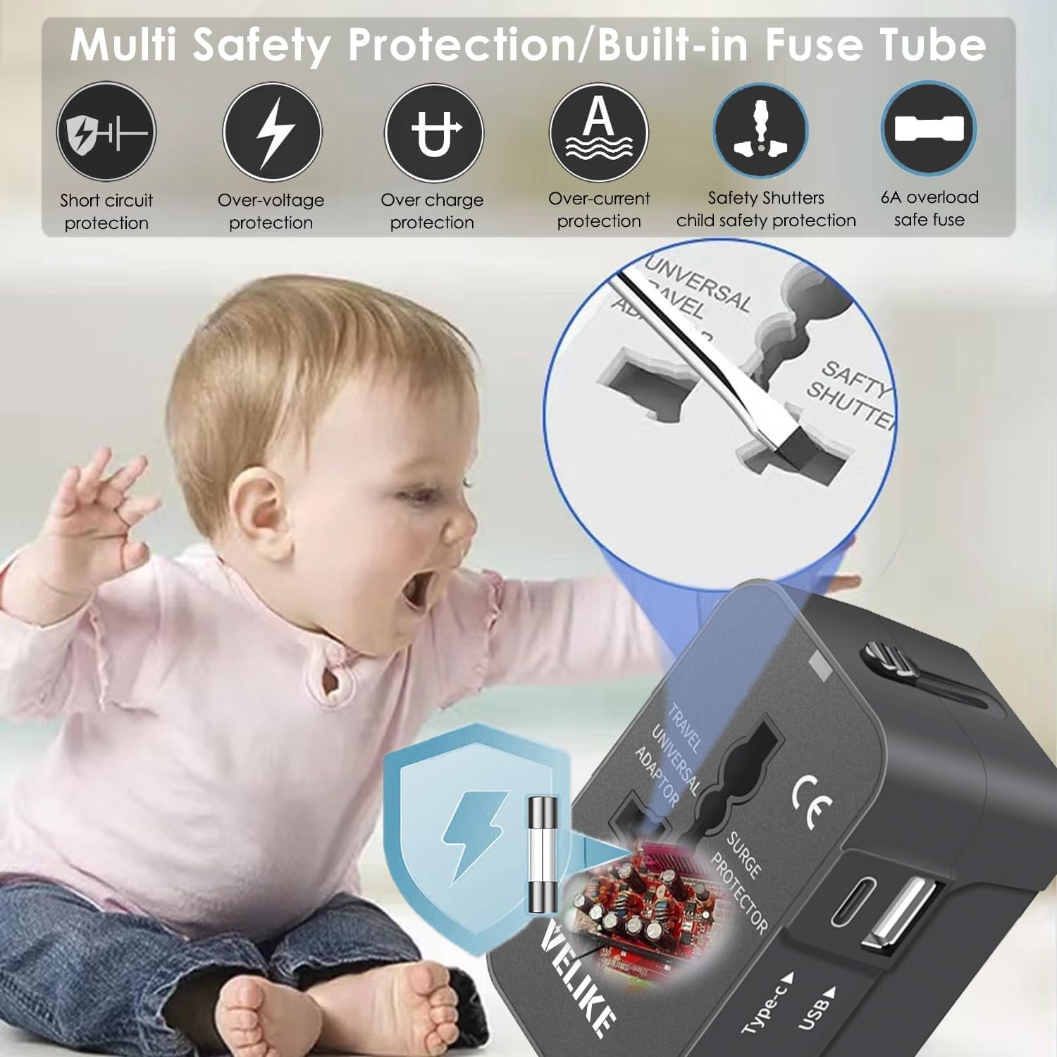 【Multiple Safety Protection】Equipped with built-in 6A fuse, child-safety shutters and plug lock system, the universal travel charger provides over-temperature, over-current, over-voltage, overloads and short-circuit protection. In addition, it is certified by RoHS, CE, PSE and FCC, ensuring its safety and reliability.