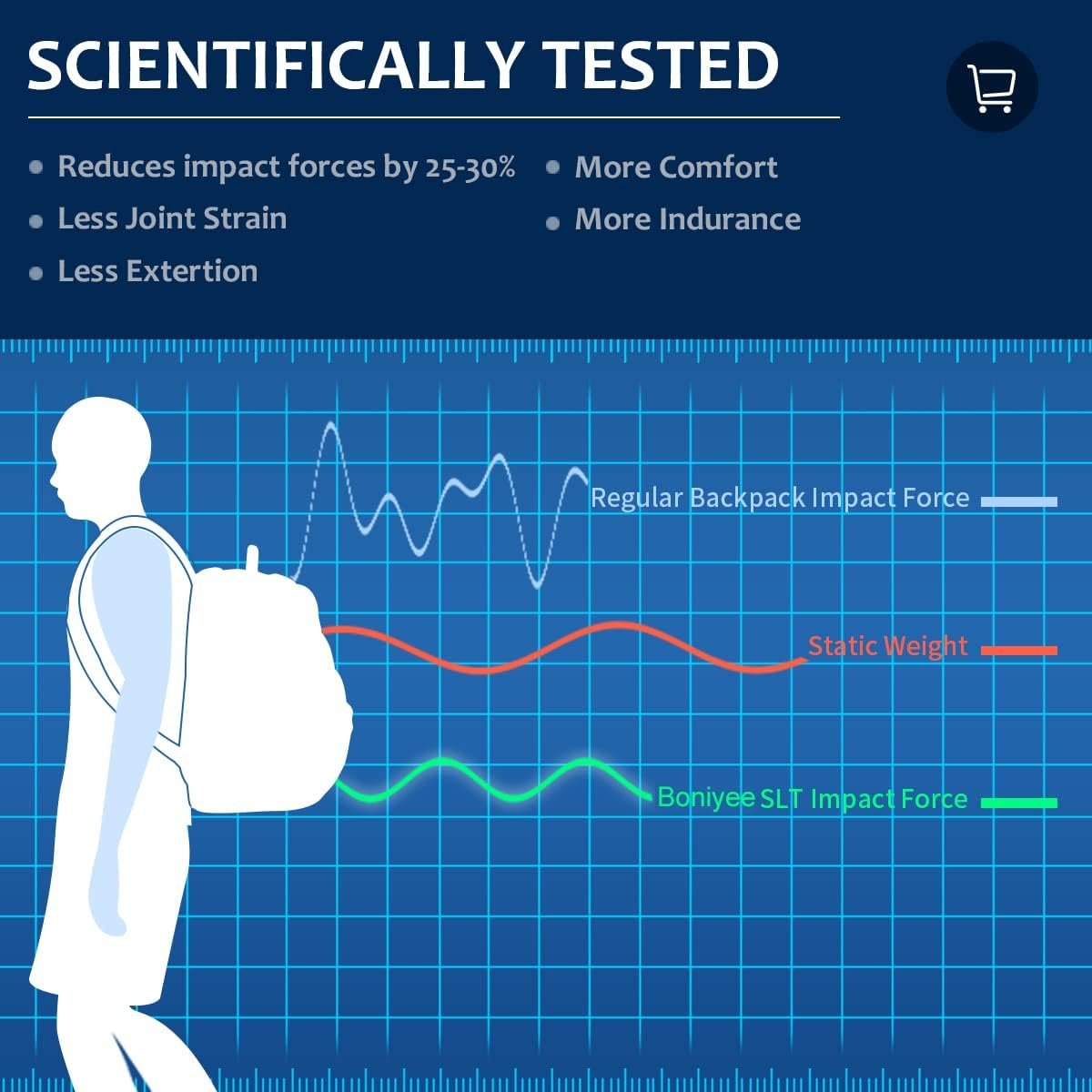 Typical backpack the load is firmly attached to your back so as you move the pack moves with you, with each step the weight accelerates and decelerates up and down, these dynamic forces are as much as three times the static weight in the pack, BONIYEE SLT Backpack separates the load from your back, the load floats on a hidden suspended load system reducing both the dynamic load and the impact forces by 25-30%. The stress on your body is cut dramatically, this in turn reduces your metabolic effort giving you more endurance. Now we want to bring this amazing technology to customers we know that you might want different packs, STL Backpack is a 55L rugged backpack that is designed as a versatile backpack that can be used for school, sport, business, traveling, or a weekend getaway, it has enough capacity for 4 people on a three-day.