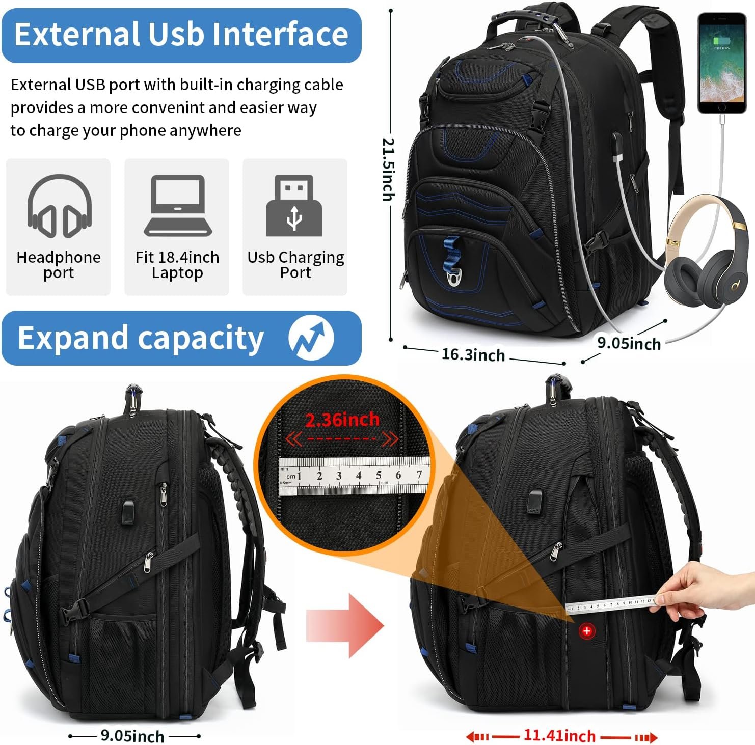 Exterior size:22*16.3*10 inch, Normal capacity is 55L, After Expanding:65L. This big College School Bookbag with expandable feature offers you more packing capacity than a standard laptop backpack.Fits most 19,18.4,18,17.3,17,15.6,15 inch laptops.Perfect for Large gaming laptop 18.4,19 inches, and up