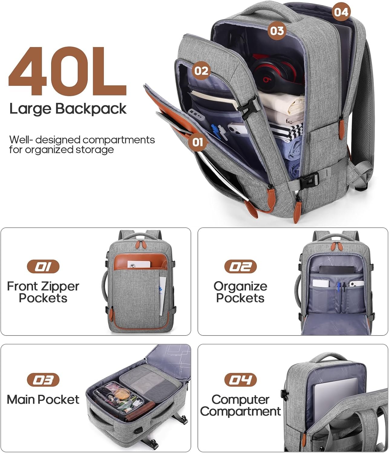 Multiple Pockets / Large Capacity-This weekender backpack features a padded 17-inch laptop compartment, a spacious main pocket for daily essentials, and multiple front zipper pockets for quick access to items like ID, keys, and electronics. Side pockets fit a water bottle, while the anti-theft back pocket keeps valuables safe.